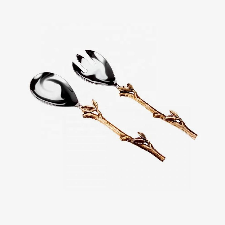 ชุดเสิร์ฟสลัดก้านหรูหราพร้อมที่จับดีไซน์ใบไม้ชุดเสิร์ฟอาหารนิ้วชุดเสิร์ฟสลัดช้อนและส้อม