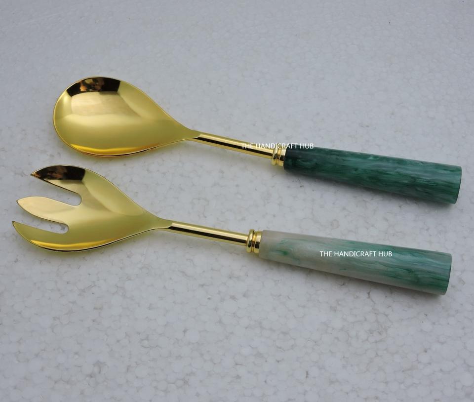 ชุดช้อนตักสลัดแบบยาว ดีไซน์เรียบหรู สีทองขัดเงา พร้อมด้ามจับเรซิ่นทำมือ