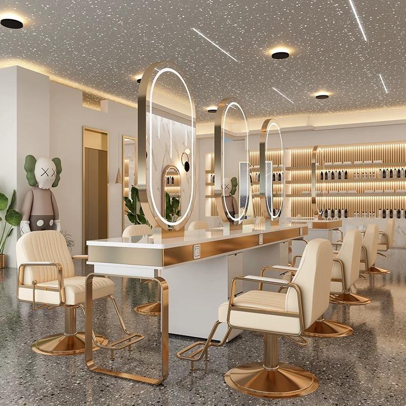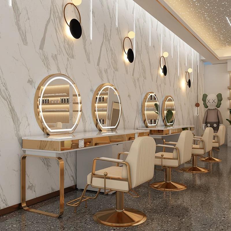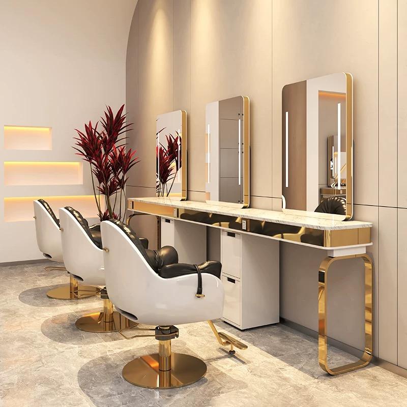 สถานีกระจกแต่งผม LED สองด้าน สำหรับร้านเสริมสวย โต๊ะผ้าทนทานสำหรับ 2/3/4 คน เหมาะสำหรับห้างสรรพสินค้าและร้านฝึกสอนทำผม