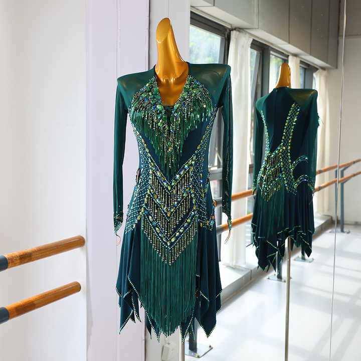 ชุดแข่งขันซัลซ่ารัมบ้า ชุดเต้นลาตินสำหรับผู้หญิงมืออาชีพ แขนยาวผ้าตาข่ายโปร่ง โชว์หลังสำหรับการเต้นบอลรูม