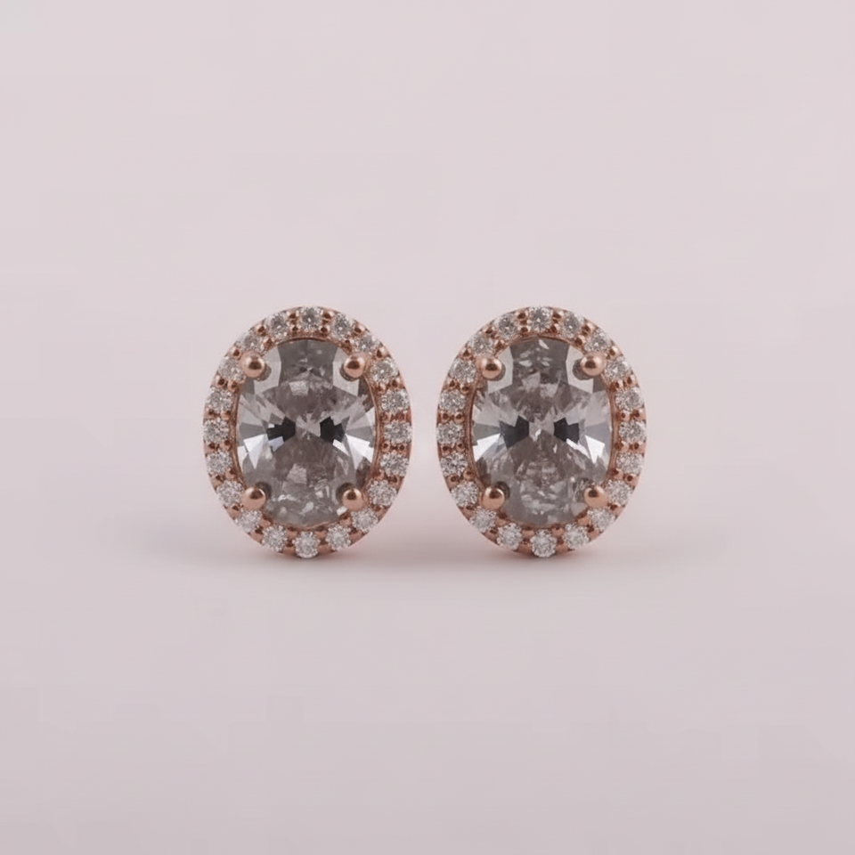 ต่างหูเพชรรูปวงรีตัดรูปกุหลาบเกลือและพริกไทยสำหรับเป็นของขวัญทำจากห้องปฏิบัติการรัศมีเพชร