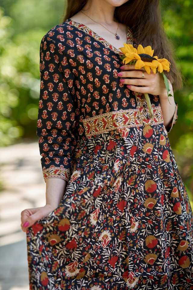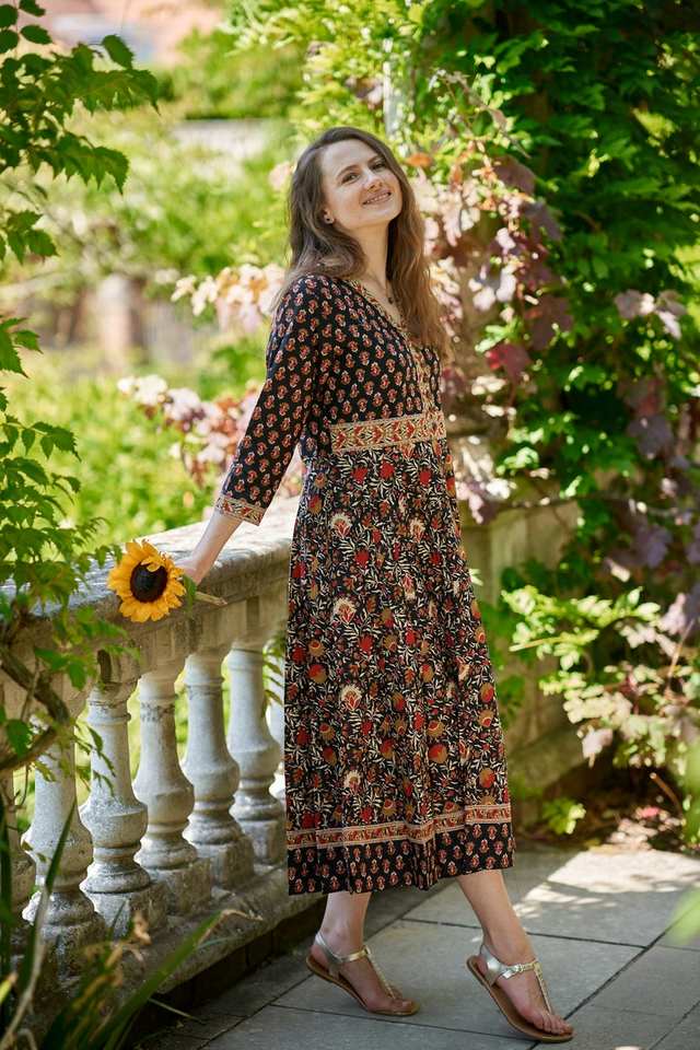 ชุดเดรสผ้าฝ้ายแท้พิมพ์ลายด้วยมือสไตล์โบฮีเมียน ซัมซารา แฟชั่นที่เป็นมิตรต่อสังคมและสวมใส่สบายๆ ในโอกาสต่างๆ