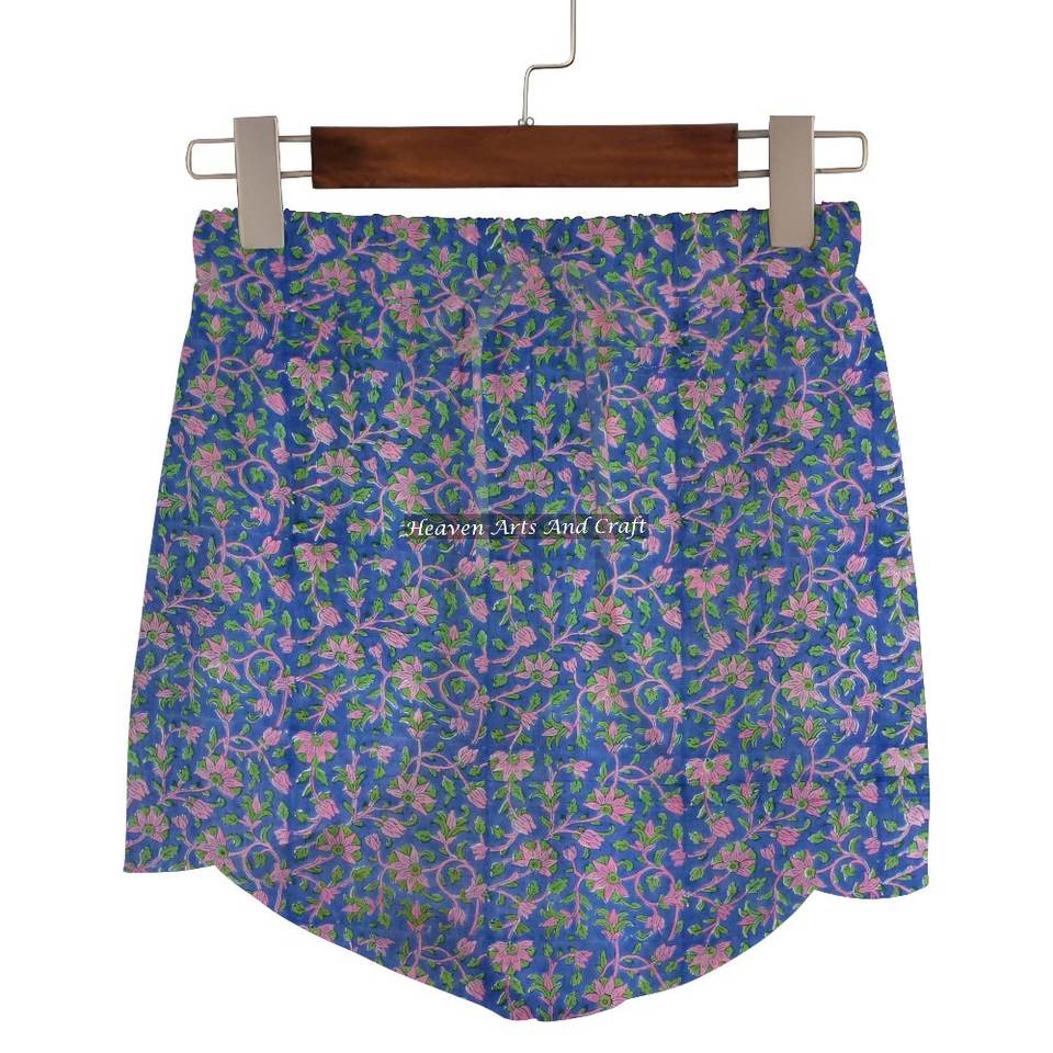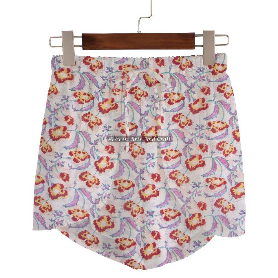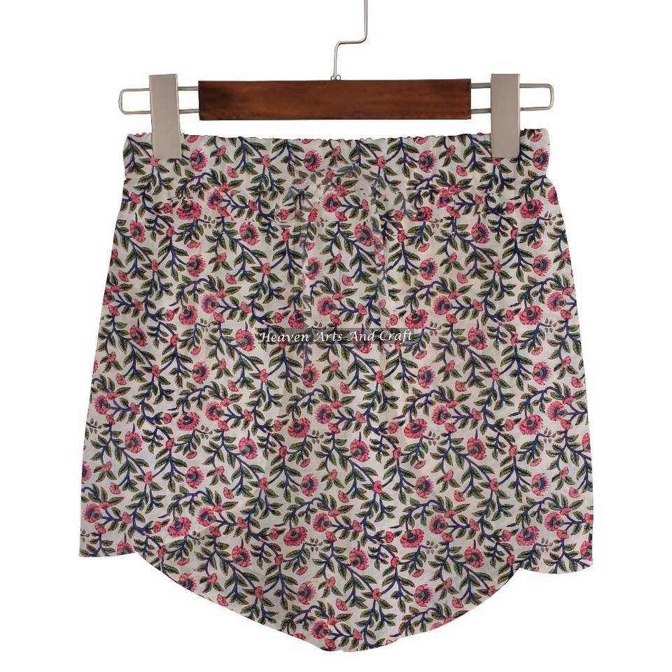 กางเกงขาสั้นผ้าฝ้ายพิมพ์ลายบล็อก Sanganeri สำหรับผู้หญิง ชุดลำลองฤดูร้อน กางเกงขาสั้นผ้าฝ้ายพิมพ์ลายบล็อก คอลเลคชั่นสำหรับสาวๆ ไปเที่ยวทะเล