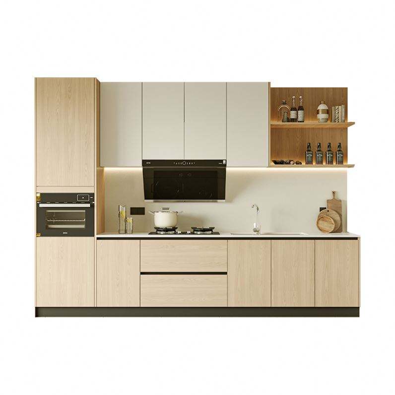 ครัวทันสมัยหรูหรา Sanpotova: ตู้ครัวไม้สีอ่อนและเตาอบแบบบิวท์อิน