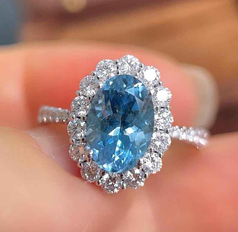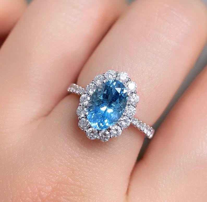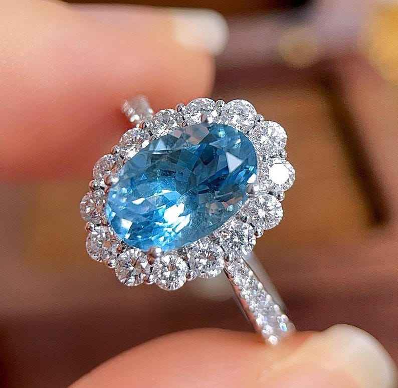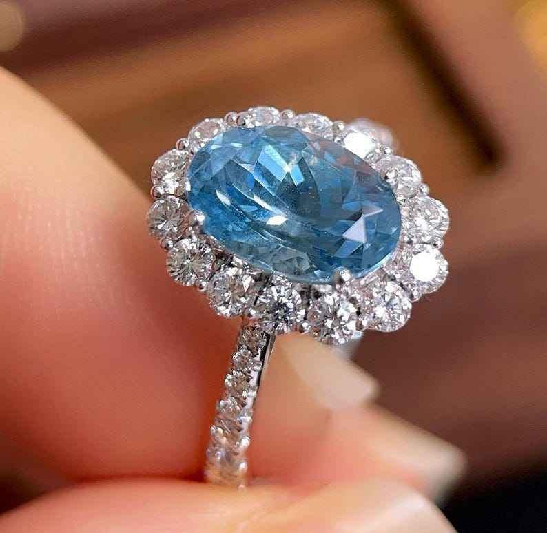 แหวนซานตา มาเรีย อะความารีน ฮาโล 18K ทองคำขาว งานแฮนด์เมด สำหรับงานหมั้น งานแต่งงาน เครื่องประดับชั้นดี ของขวัญสำหรับผู้หญิง สง่างาม