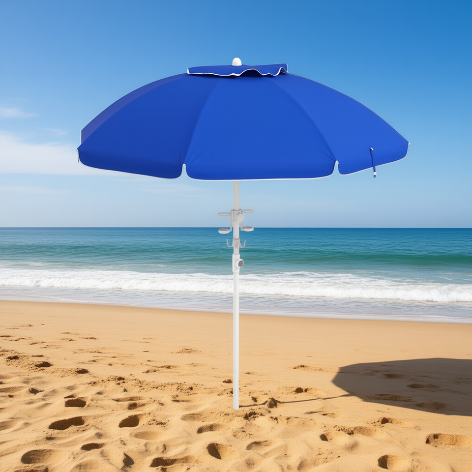 ร่มชายหาดสีน้ำเงินแซฟไฟร์ ขนาด 8 ฟุต ผ้าโพลีเอสเตอร์ พร้อมที่วางแก้ว สำหรับใช้บนชายหาด
