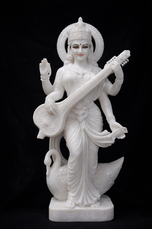 รูปปั้นเทพเจ้าสรัสวดีที่สง่างามของสถาปนิกชาวอินเดียทำด้วยมือดีไซน์แบบดั้งเดิมสำหรับใช้ในร่มและสวน
