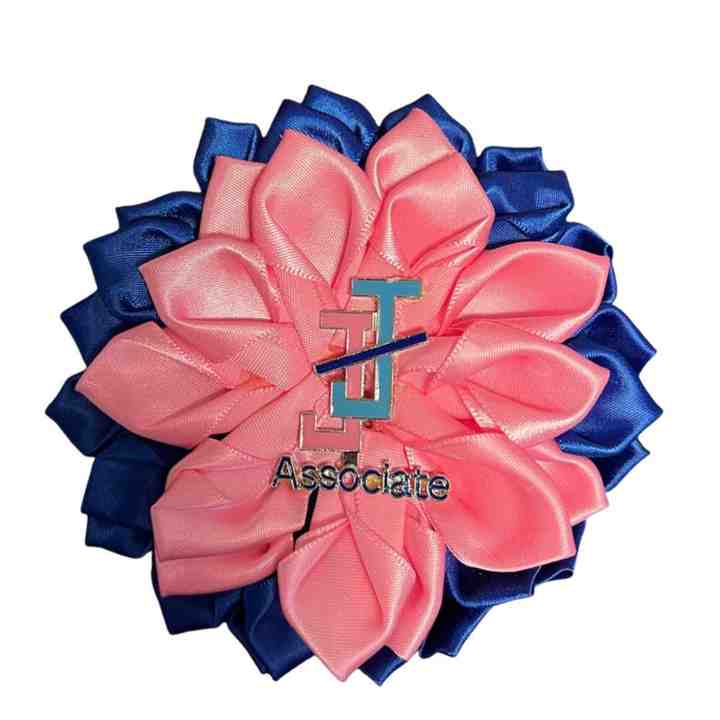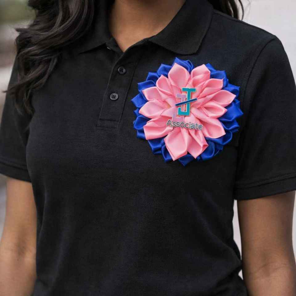 เข็มกลัดซาตินแจ็คแอนด์จิล ลายดอกไม้สีชมพูและสีฟ้า พร้อมโลโก้ เข็มกลัดสวยหรูมีสไตล์สำหรับสมาชิกแจ็คแอนด์จิล