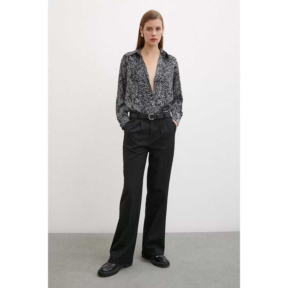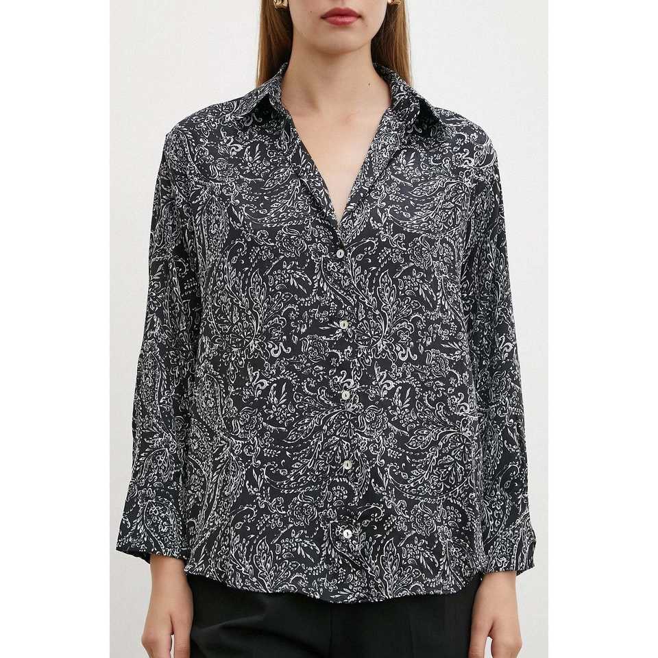 เสื้อเชิ้ตผ้าซาตินลายเพสลีย์สีดำติดกระดุม เสื้อเชิ้ตผู้หญิงลำลองสำหรับใส่ทุกวัน