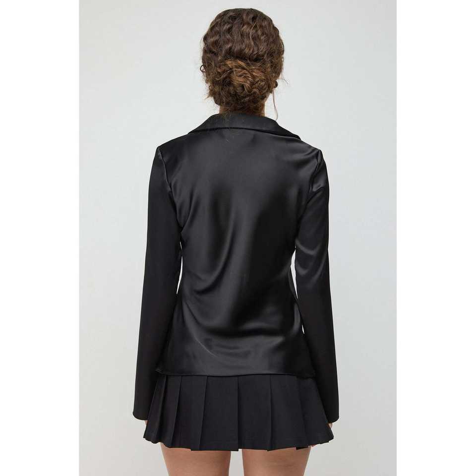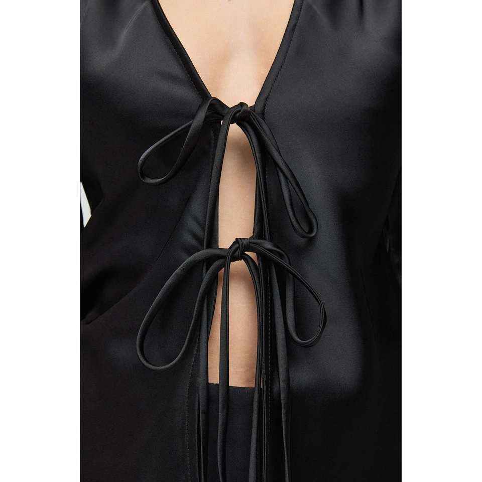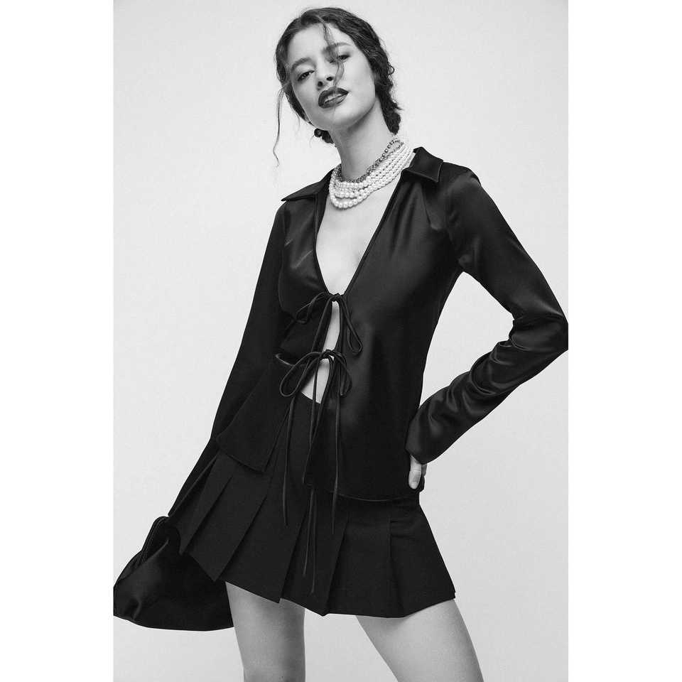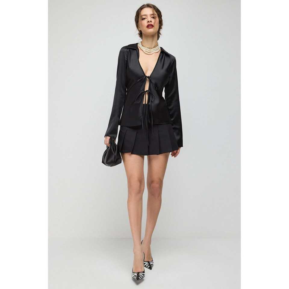เสื้อเชิ้ตผ้าซาตินพร้อมดีเทลผูกเชือกด้านหน้า