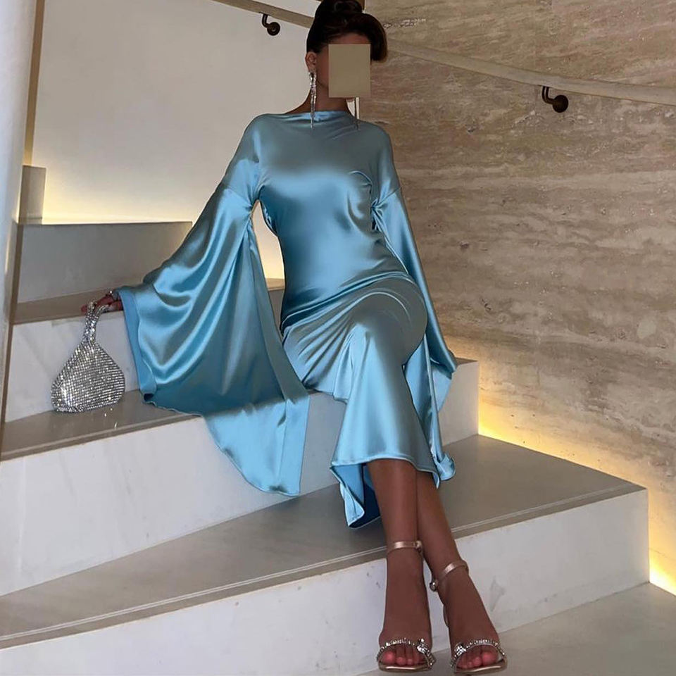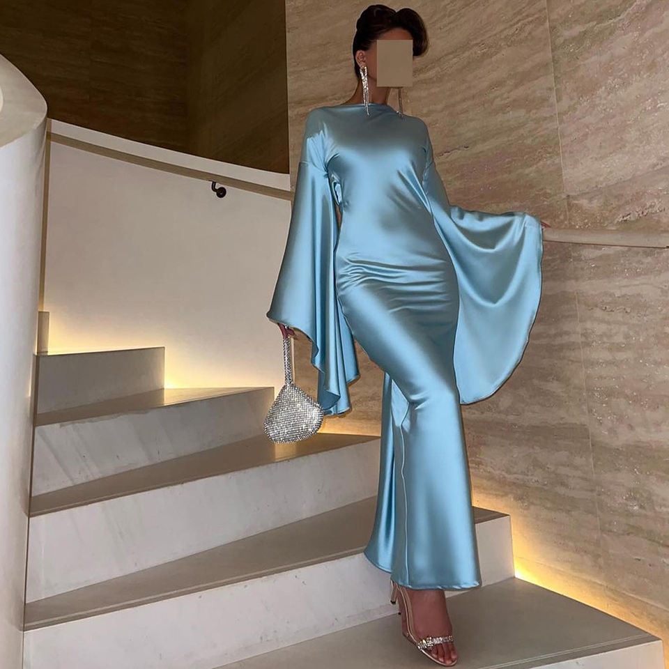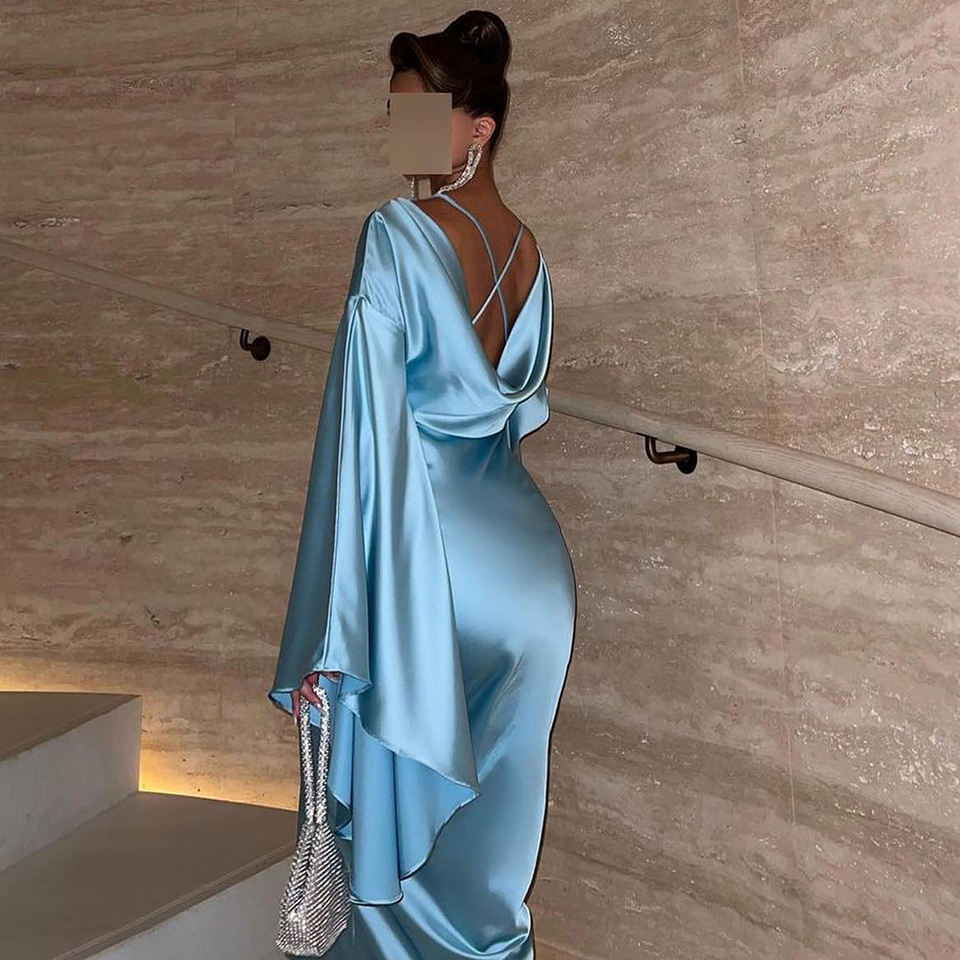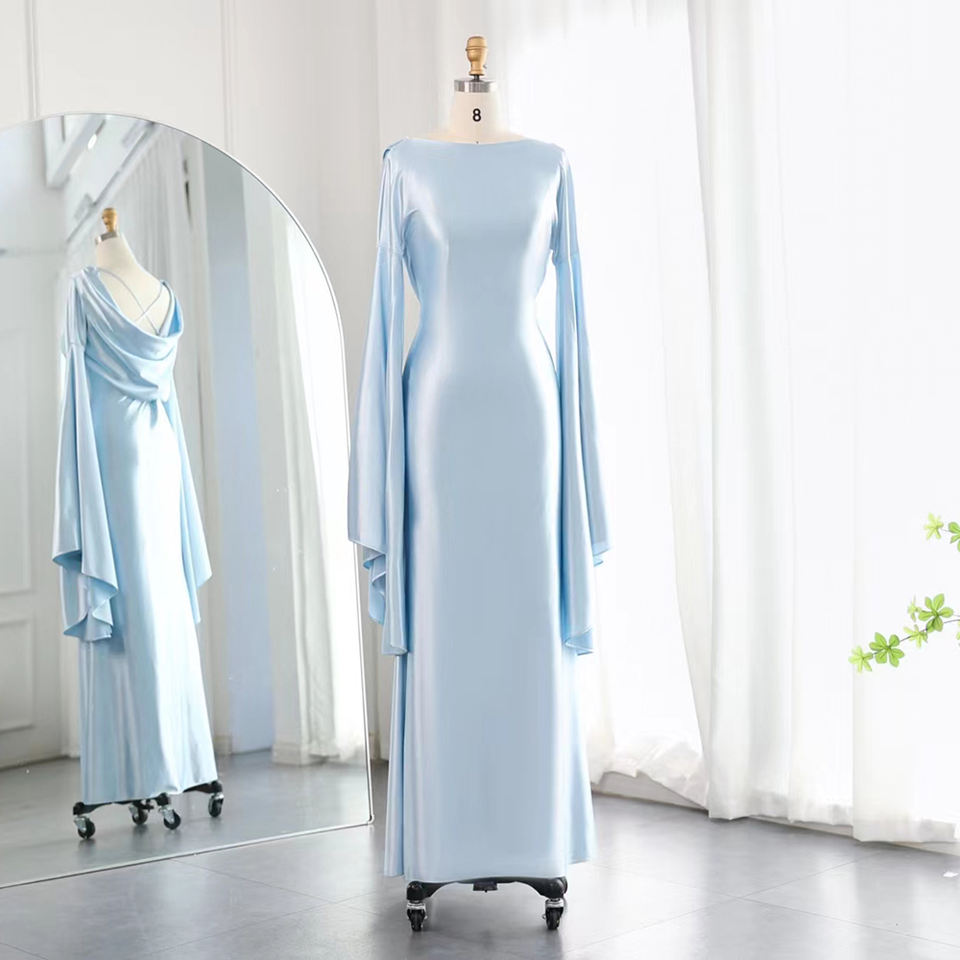 ชุดราตรีทรงเมอร์เมดสีฟ้าเทอร์ควอยซ์ผ้าซาติน แขนเสื้อแบบปีกผีเสื้อ สไตล์ดูไบ ระบายอากาศได้ดี เป็นมิตรกับสิ่งแวดล้อม ยาวกรอมพื้น แบบวินเทจ พร้อมบราในตัว