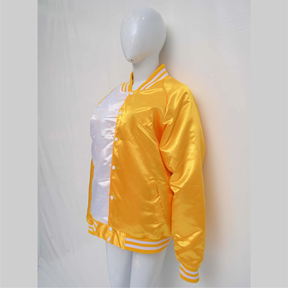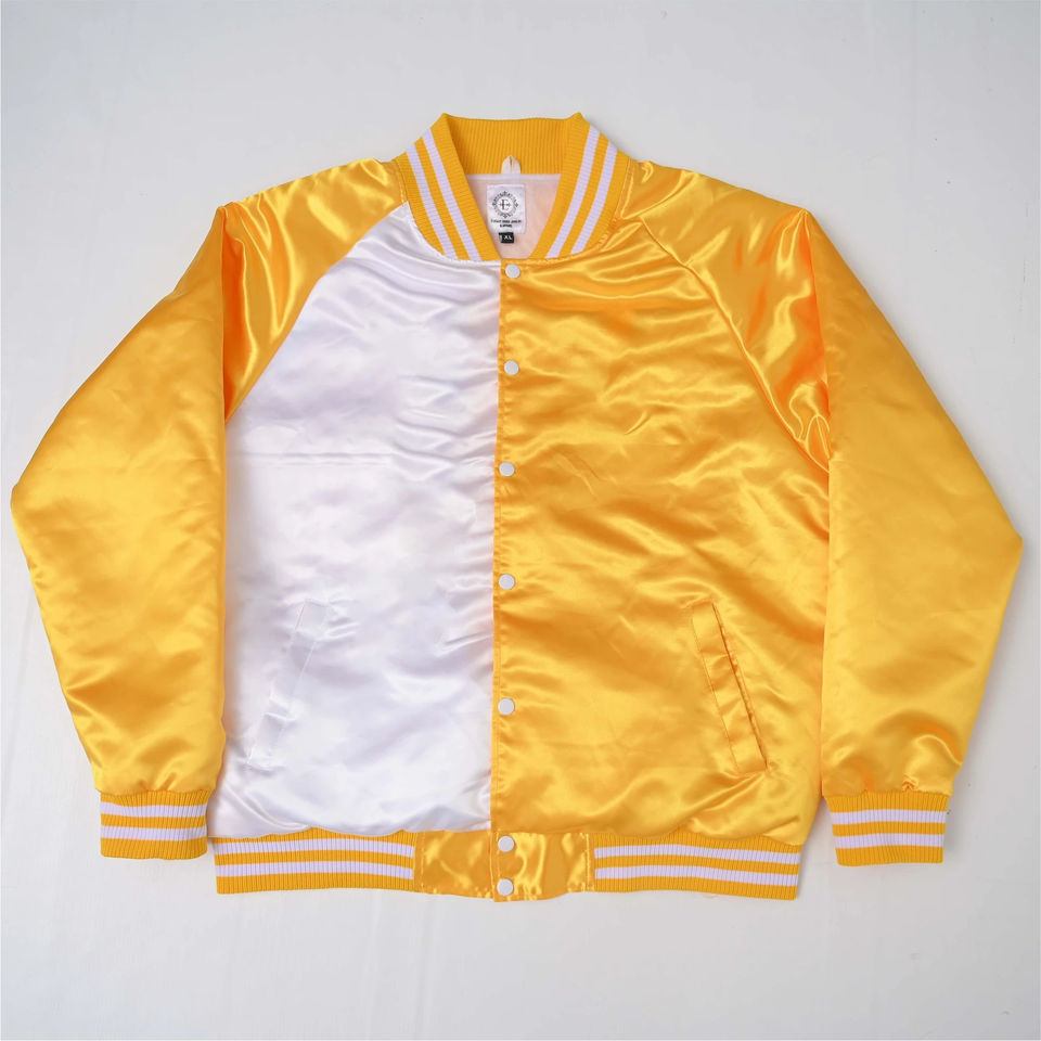 แจ็คเก็ตวาร์ซิตี้ผ้าซาตินสองสี แจ็คเก็ตบอมเบอร์แบบยูนิเซ็กซ์ แจ็คเก็ตกระดุมแป๊กผ้าซาตินเงา ซับในผ้าฝ้ายหนานุ่ม