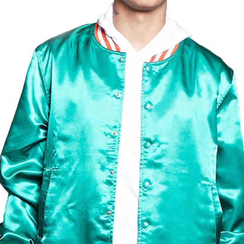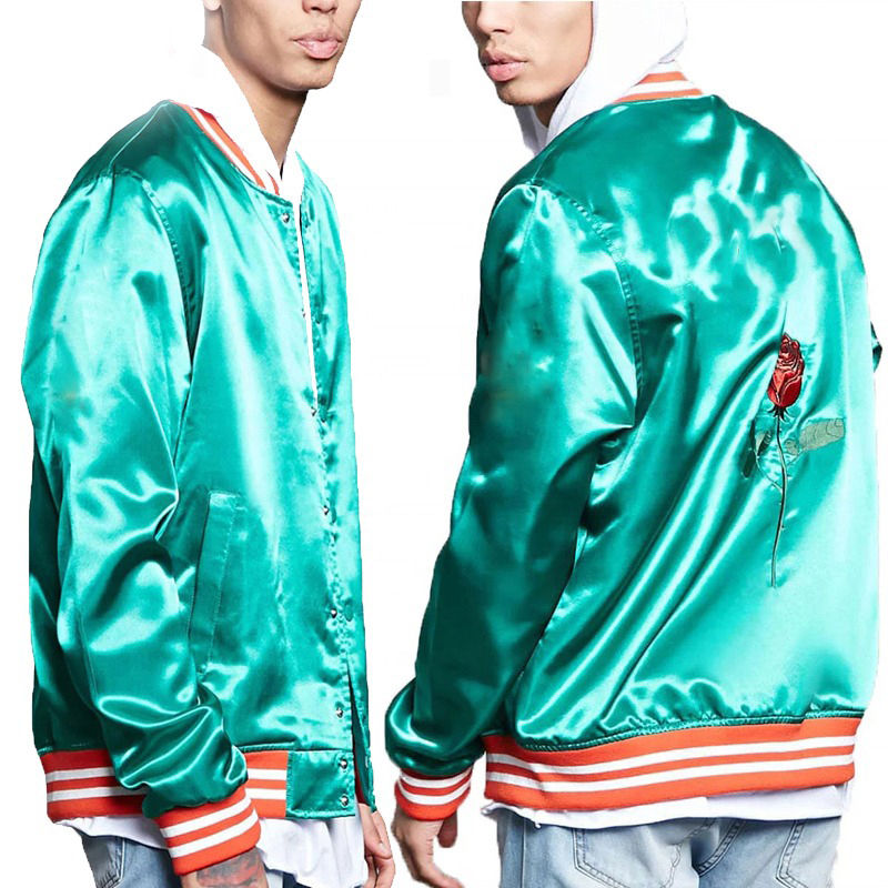 แจ็กเก็ตซาตินผ้าซาตินพร้อมตัวอักษรปัก3D แวววาวปลายแขนเสื้อและโลโก้ที่กำหนดเองขายส่ง50ชิ้น