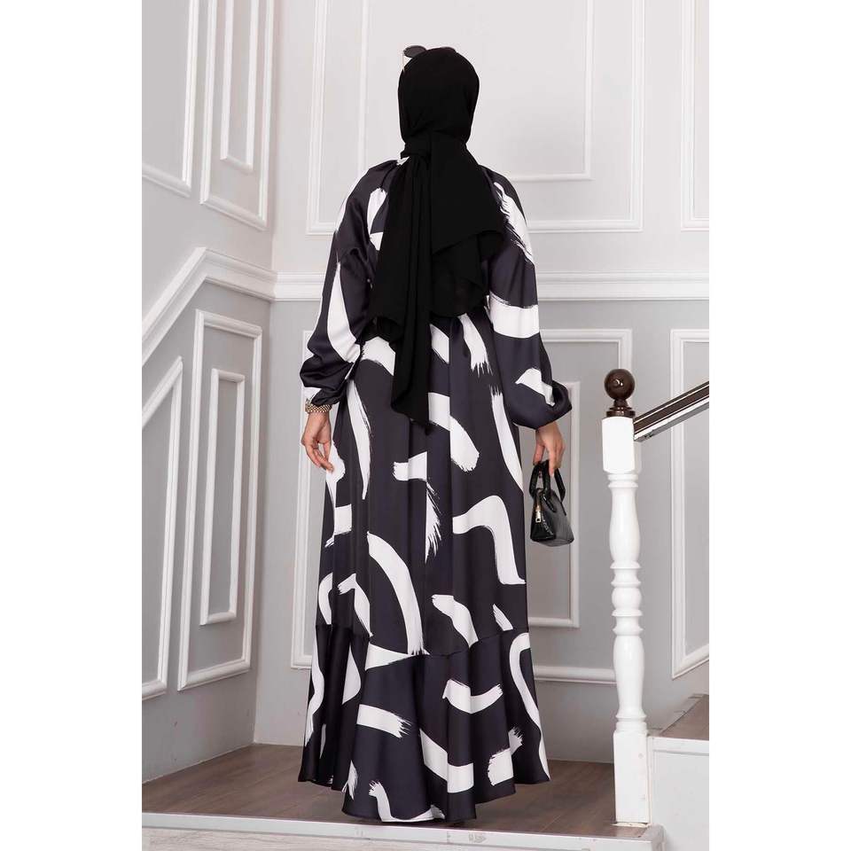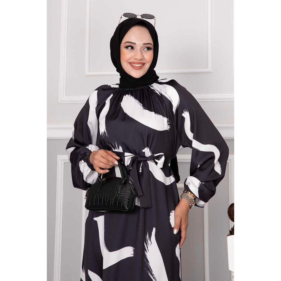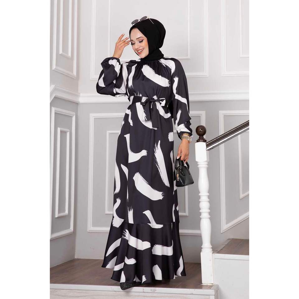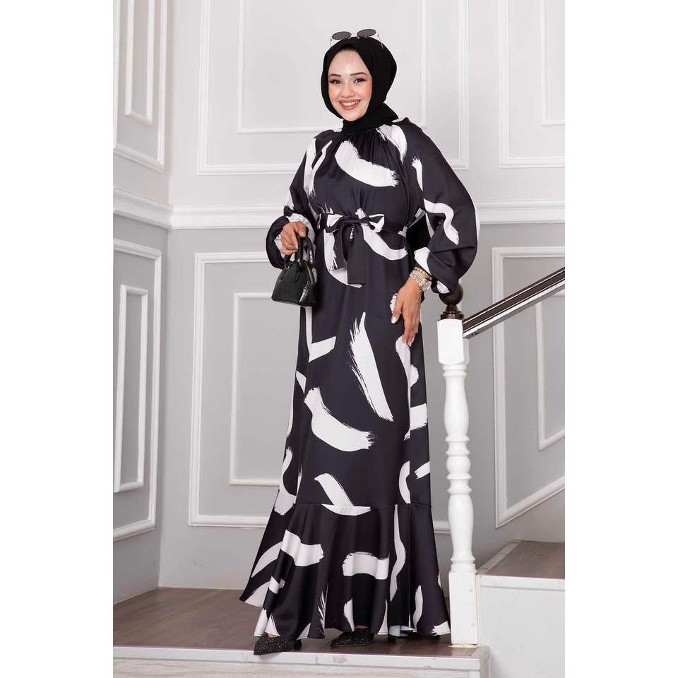 ชุดเดรสฮิญาบคาดเอวผ้าซาตินสีดำ