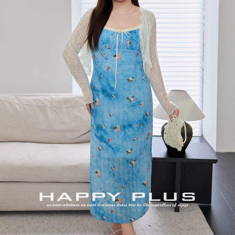 ชุดเดรสสายเดี่ยวพิมพ์ลายดอกไม้ทะเลสาบซาเยรัมสีฟ้าขนาดพลัสไซส์เอวธรรมชาติชุดลำลองสำหรับผู้หญิง N9216