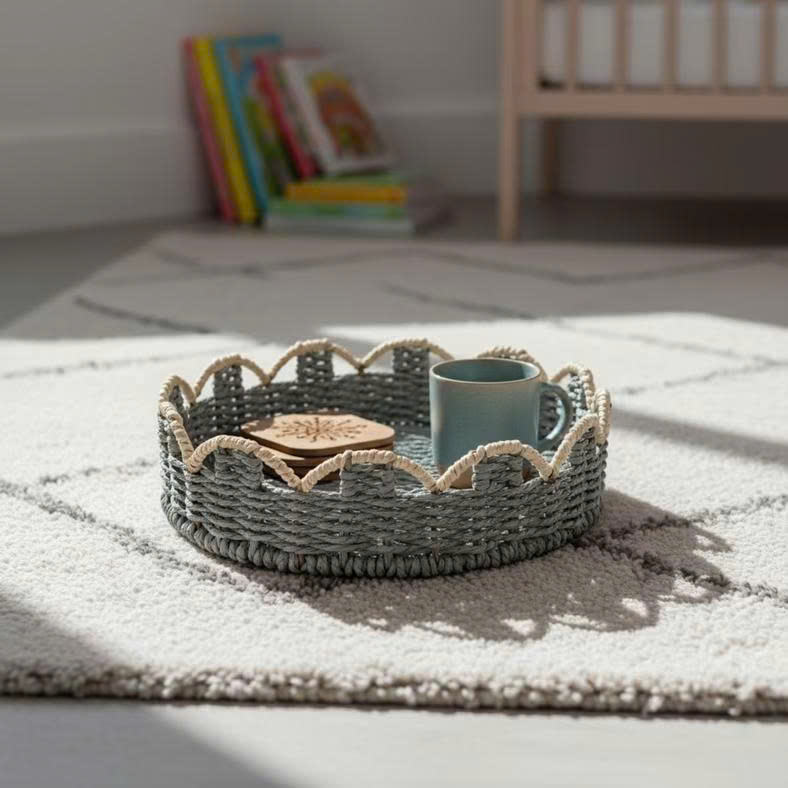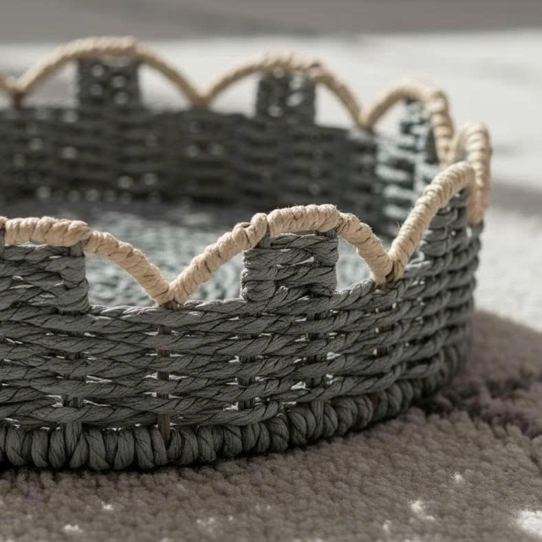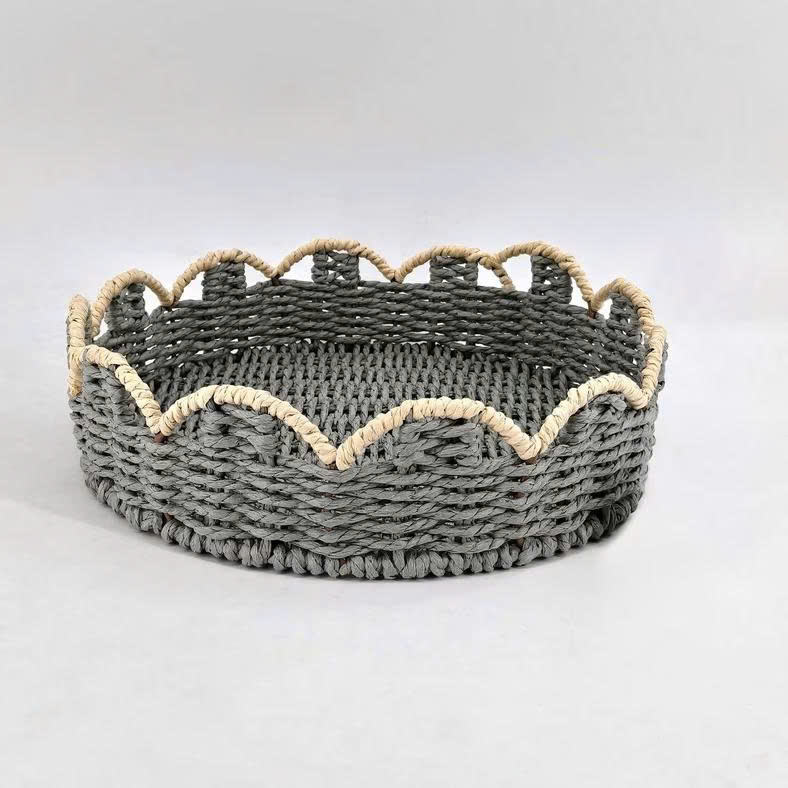 ถาดเชือกกระดาษถักลายสแกลลอป - ตะกร้าเก็บของทรงกลมสีเทาพร้อมขอบสแกลลอปสีขาวสำหรับตกแต่ง