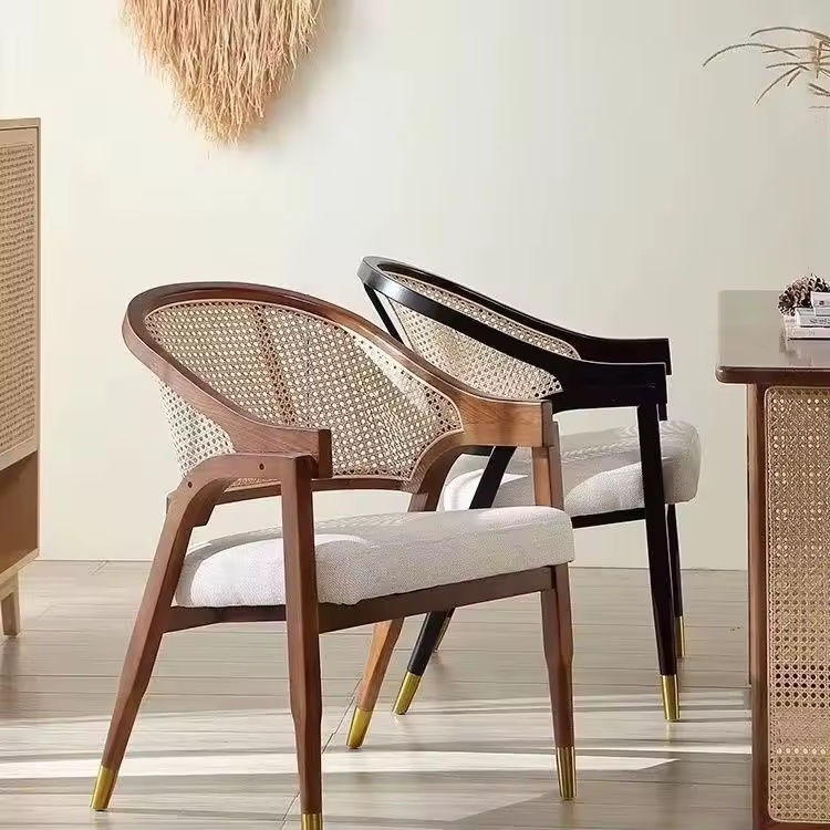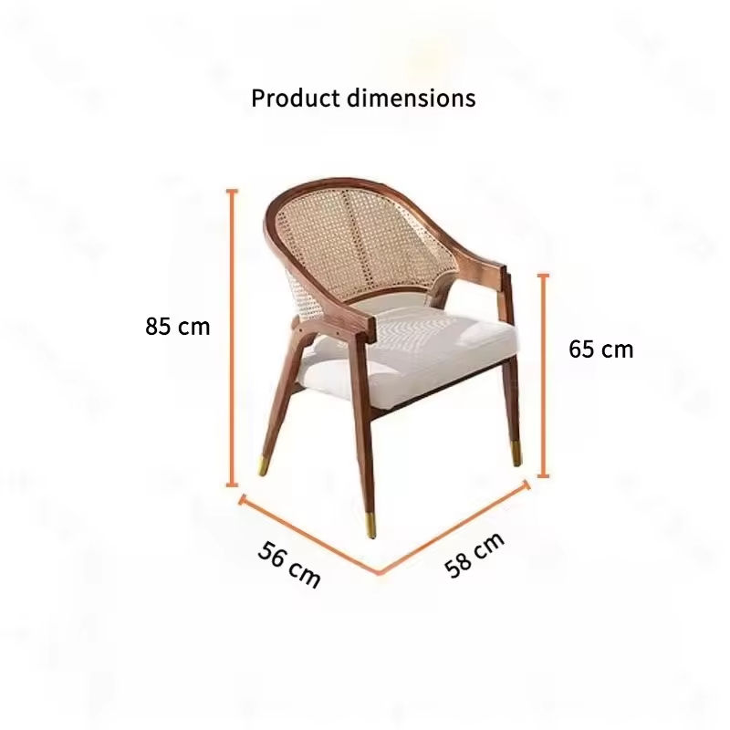 เก้าอี้ทานอาหารไม้สไตล์สแกนดิเนเวียนพร้อมเบาะนั่งบุนวมและพนักพิงหวายแบบเปิดสำหรับพื้นที่นั่งเล่น