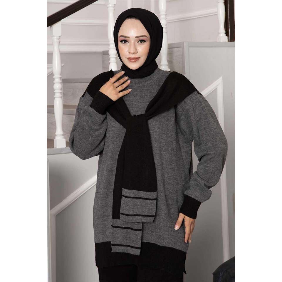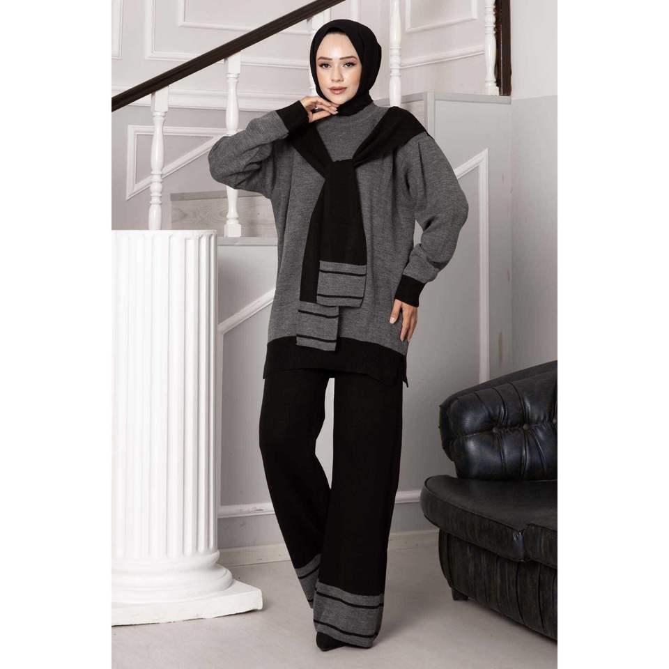 Scarfed Double Knitwear 2 Piece Set Anthracite