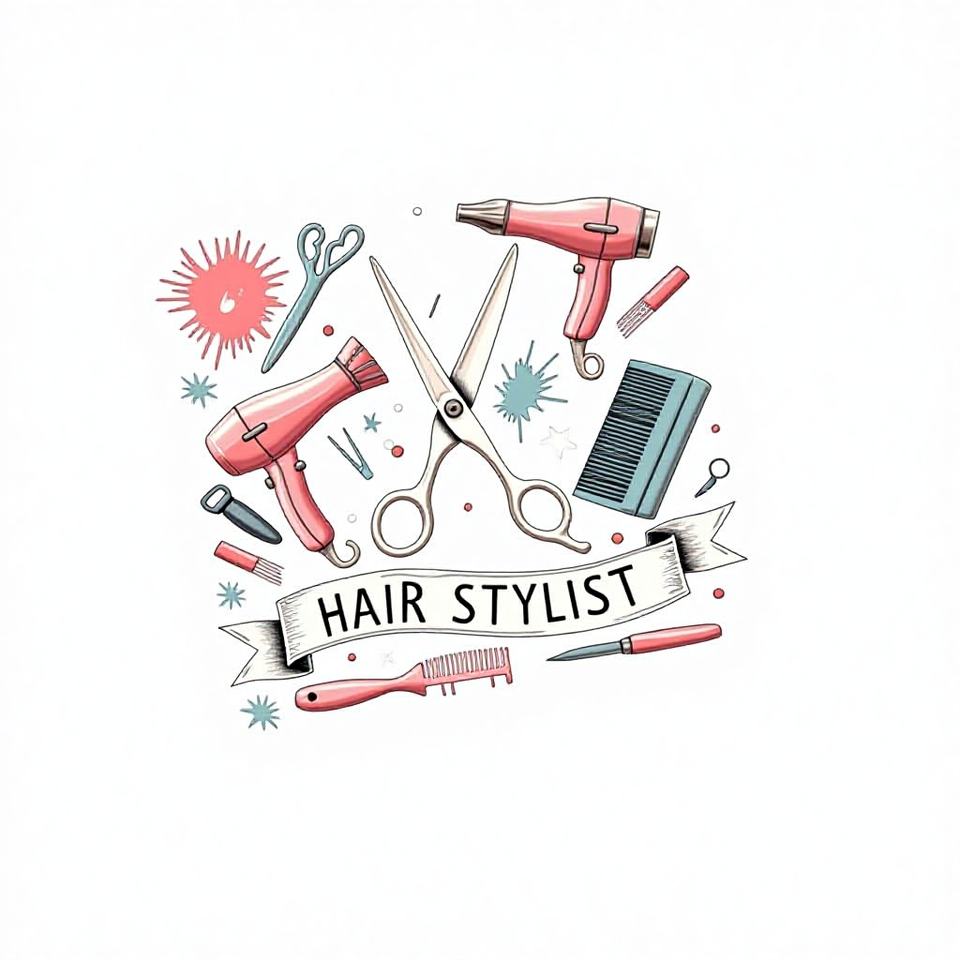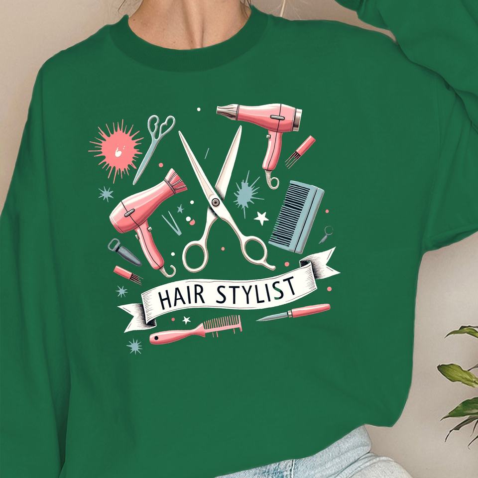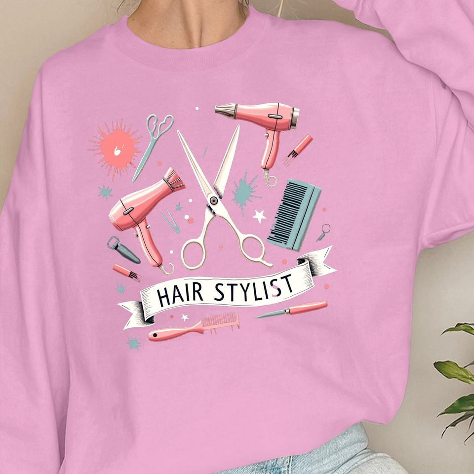 เสื้อสเวตเชิ้ตพิมพ์ลายลำลองสำหรับช่างทำผมผู้หญิง ดีไซน์ลายอุปกรณ์ทำผม