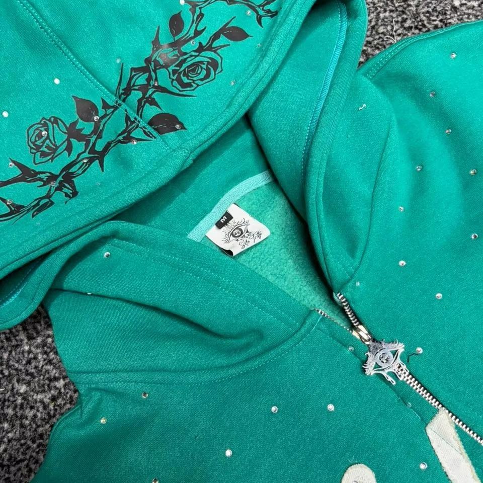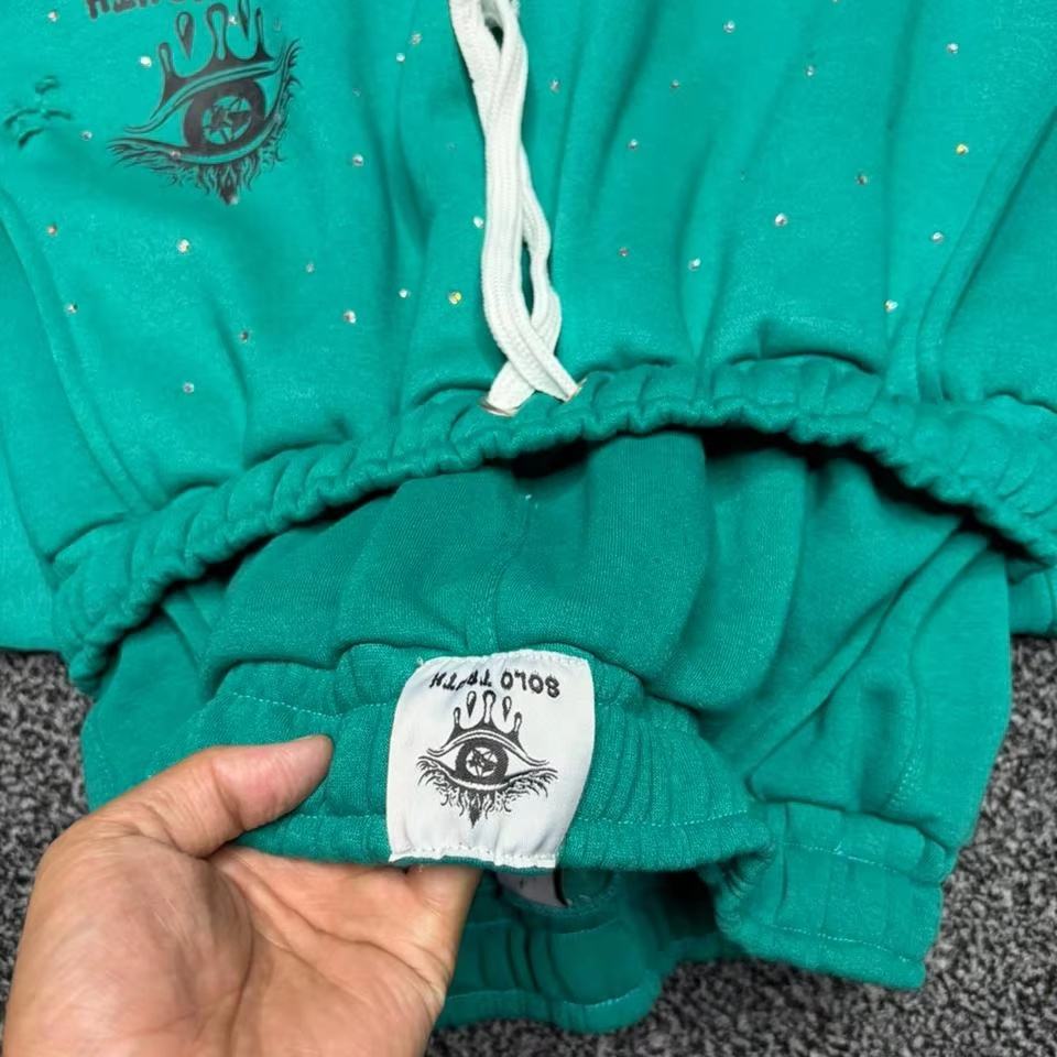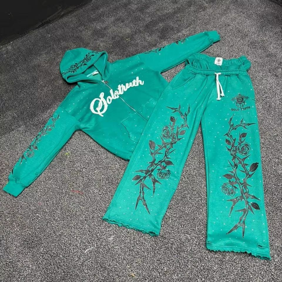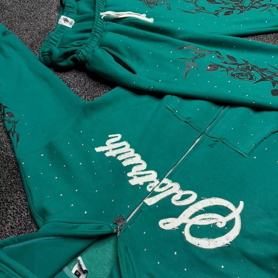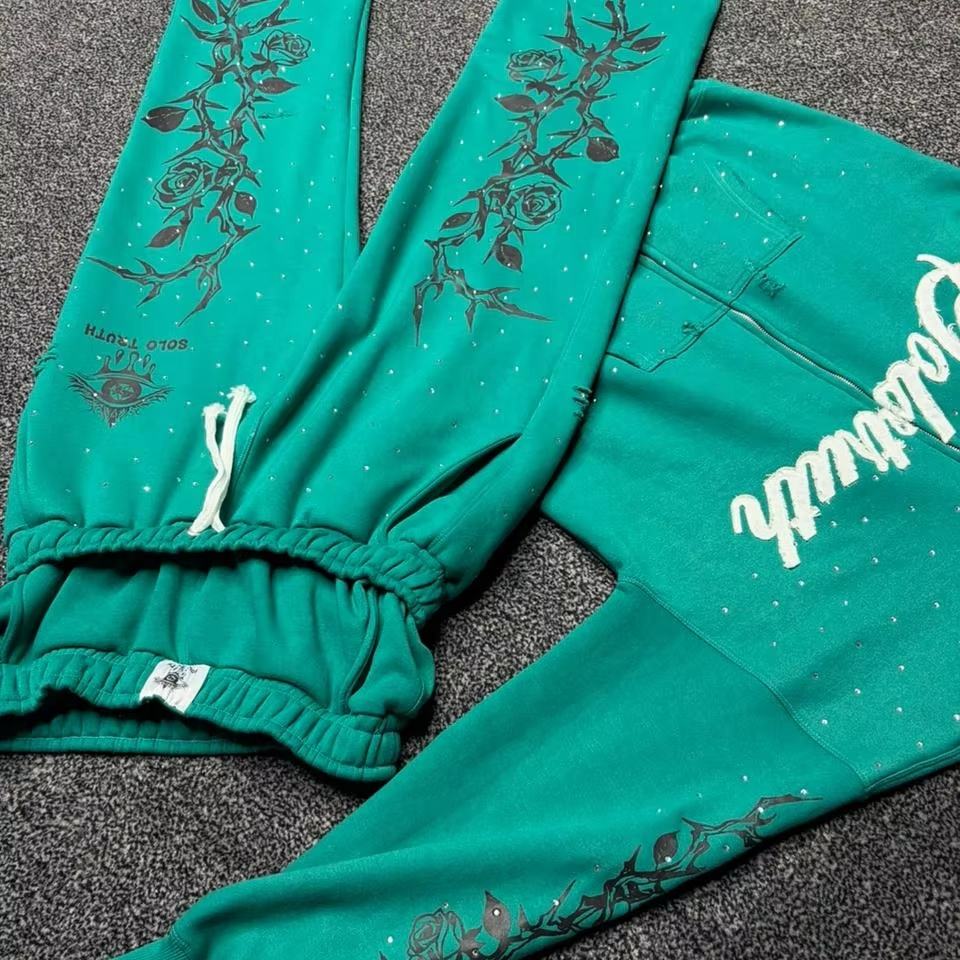 ชุดวอร์มผู้ชายแบบมีฮู้ดและกางเกงจ็อกเกอร์ ตกแต่งด้วยคริสตัลสั่งทำพิเศษ ผ้าฝ้าย/ผ้าฟลีซ พร้อมสกรีนลาย ชุดวอร์มแบบยูนิเซ็กซ์