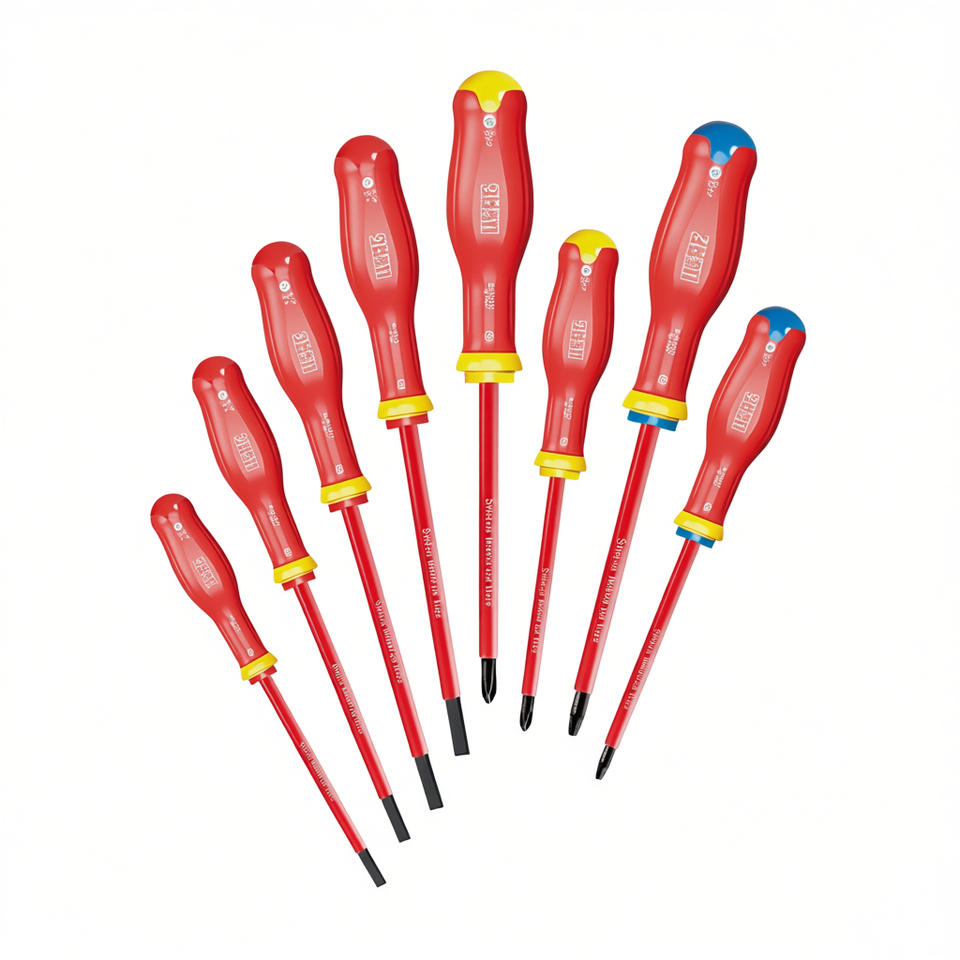 ชุดไขควงหุ้มฉนวนสีแดง 7 ชิ้น ด้ามจับพลาสติกเกรดอุตสาหกรรม พร้อมหัวสีเหลืองและสีน้ำเงิน สำหรับงานไฟฟ้า