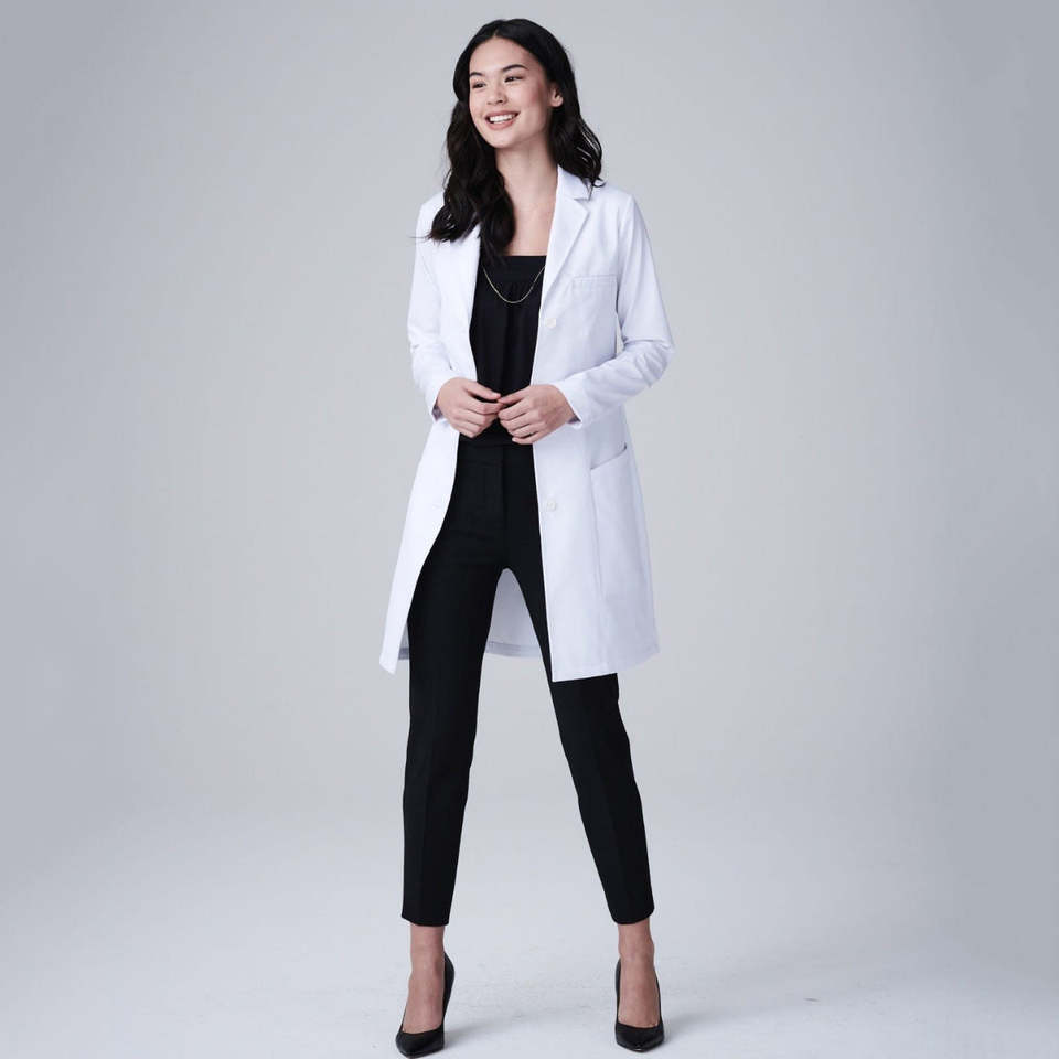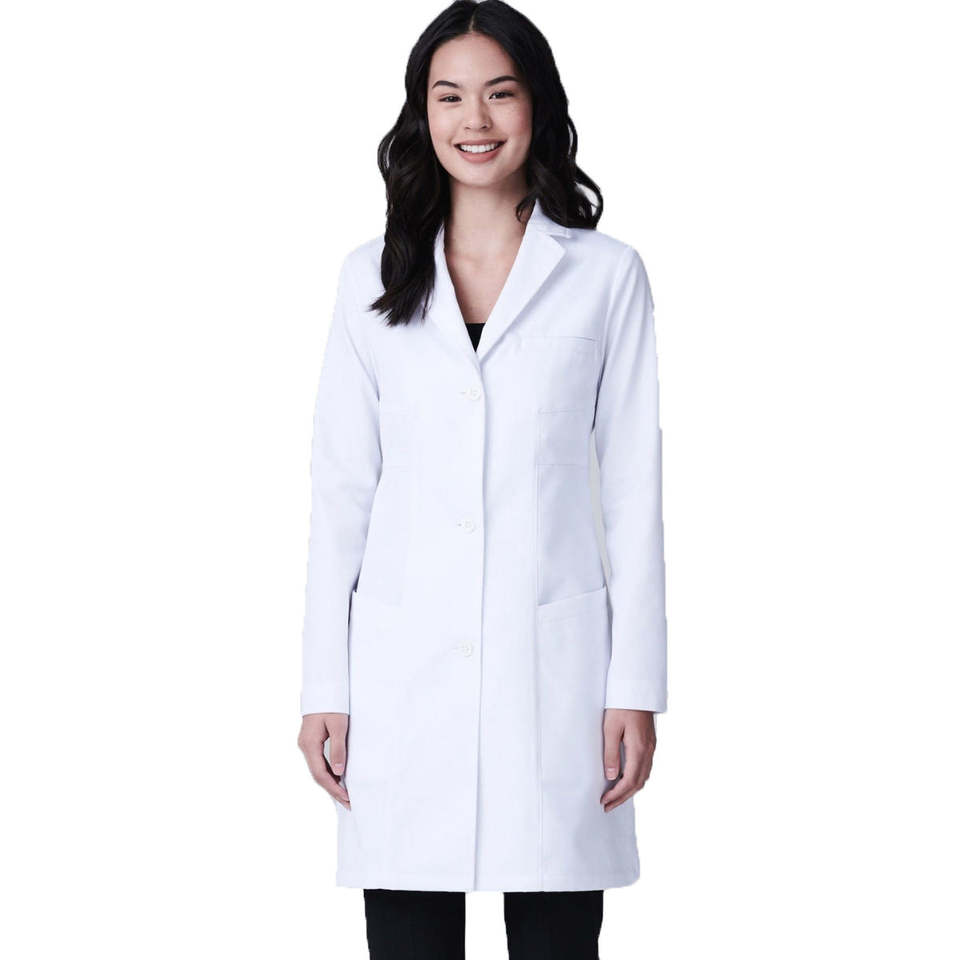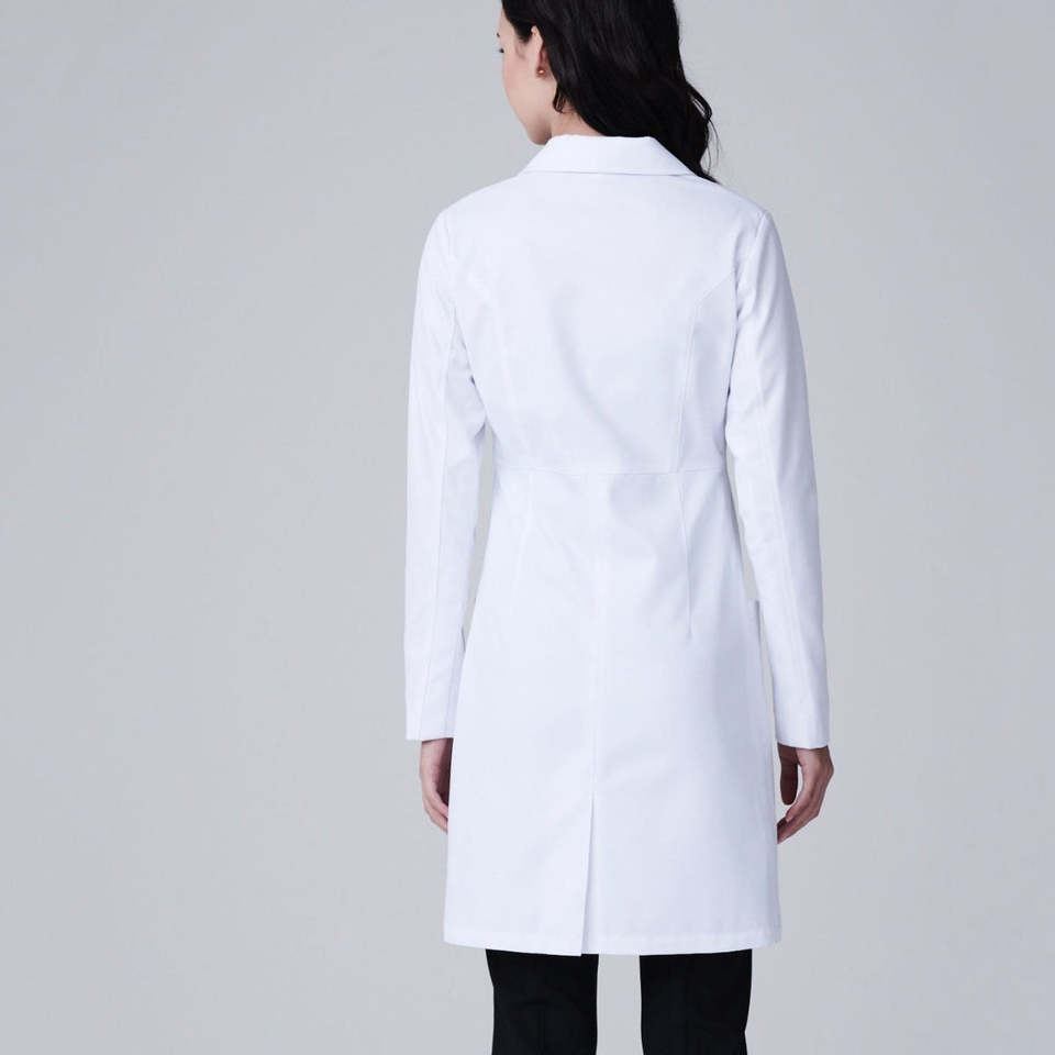 เสื้อกาวน์แพทย์แบบทอ รุ่น Scrub Nurse Modern Silhouette สำหรับทุกเพศ สีขาวล้วน ขอบเรียบ ทนทาน ใช้ในโรงพยาบาลได้ทุกวัน ตรวจจับการเสียดสีของเข็มได้