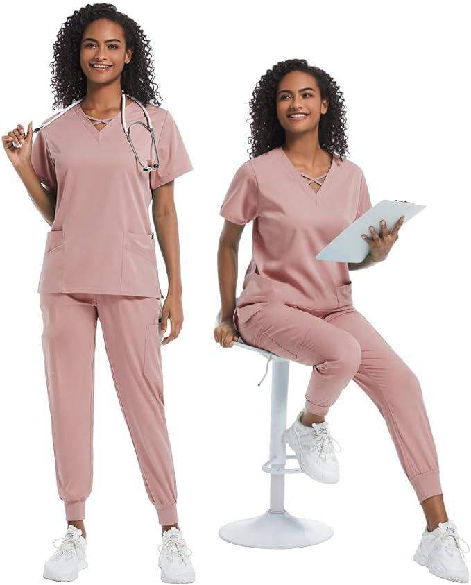 ชุดเครื่องแบบพยาบาลสำหรับผู้หญิงเสื้อคอวี & กางเกง8กระเป๋า