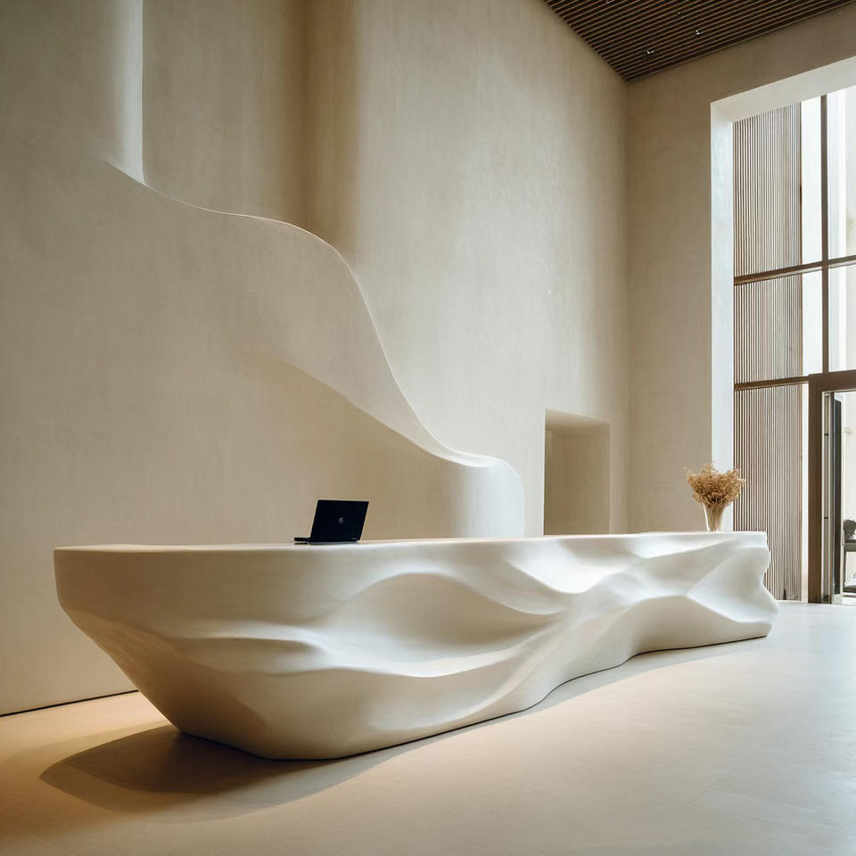 เคาน์เตอร์ต้อนรับ FluidForm รูปทรงประติมากรรม พร้อมพื้นผิวลายหินธรรมชาติ สำหรับพื้นที่เชิงพาณิชย์ระดับไฮเอนด์ ทางเข้าโรงแรม และล็อบบี้สำนักงาน