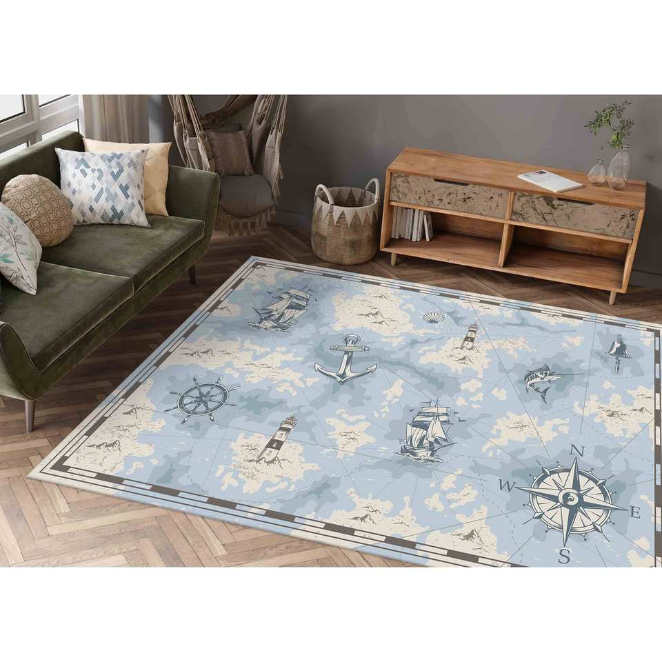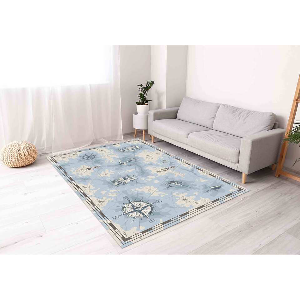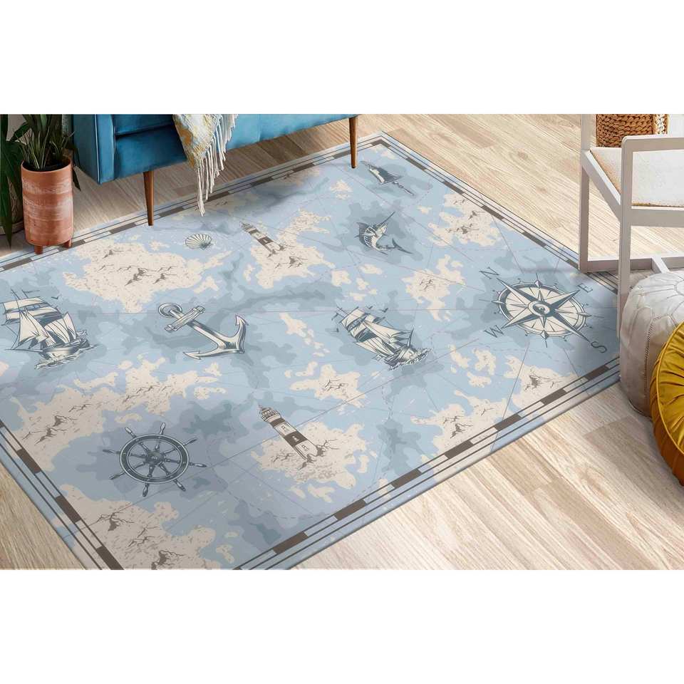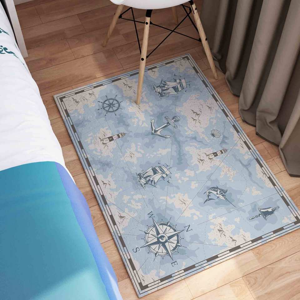 พรมลายเข็มทิศทะเล พรมพิมพ์ลาย: พรมสีน้ำเงินสำหรับห้องเด็ก พรมเนื้อนุ่มแบบไม่ทอ