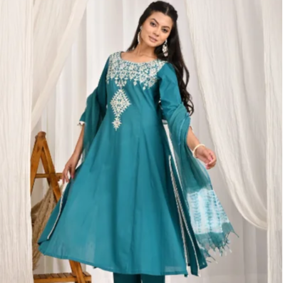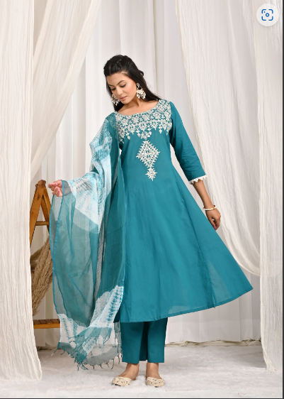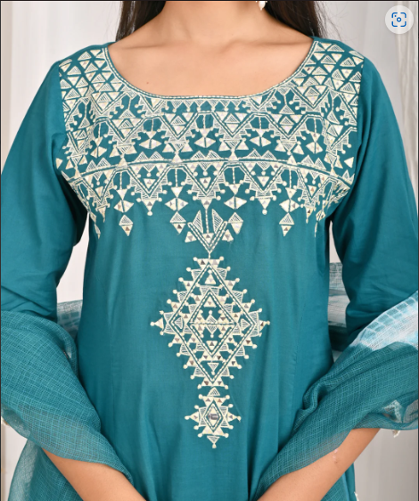 ชุดคุร์ตะทรงเอไลน์ปักลายสีเขียวทะเล พร้อมผ้าคลุมไหล่แบบ Bandhej