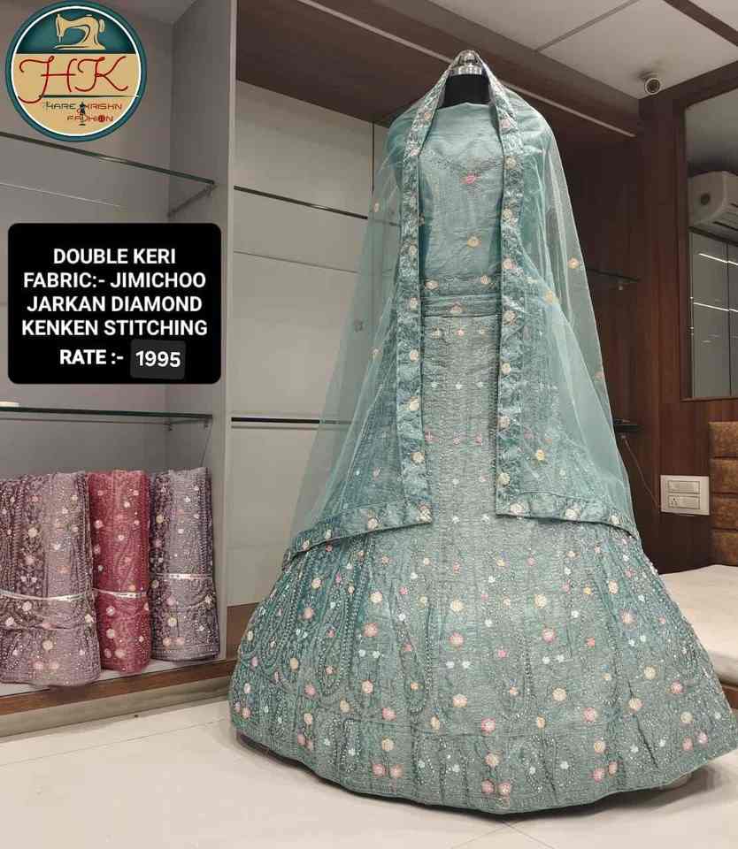 ชุดเลเฮนกาโชลีผ้าสีเขียวทะเล ยี่ห้อ Jimmy Choo ประดับเพชร Jarkan พร้อมผ้าคลุมไหล่ผ้าตาข่ายเข้าชุด สำหรับงานแต่งงาน