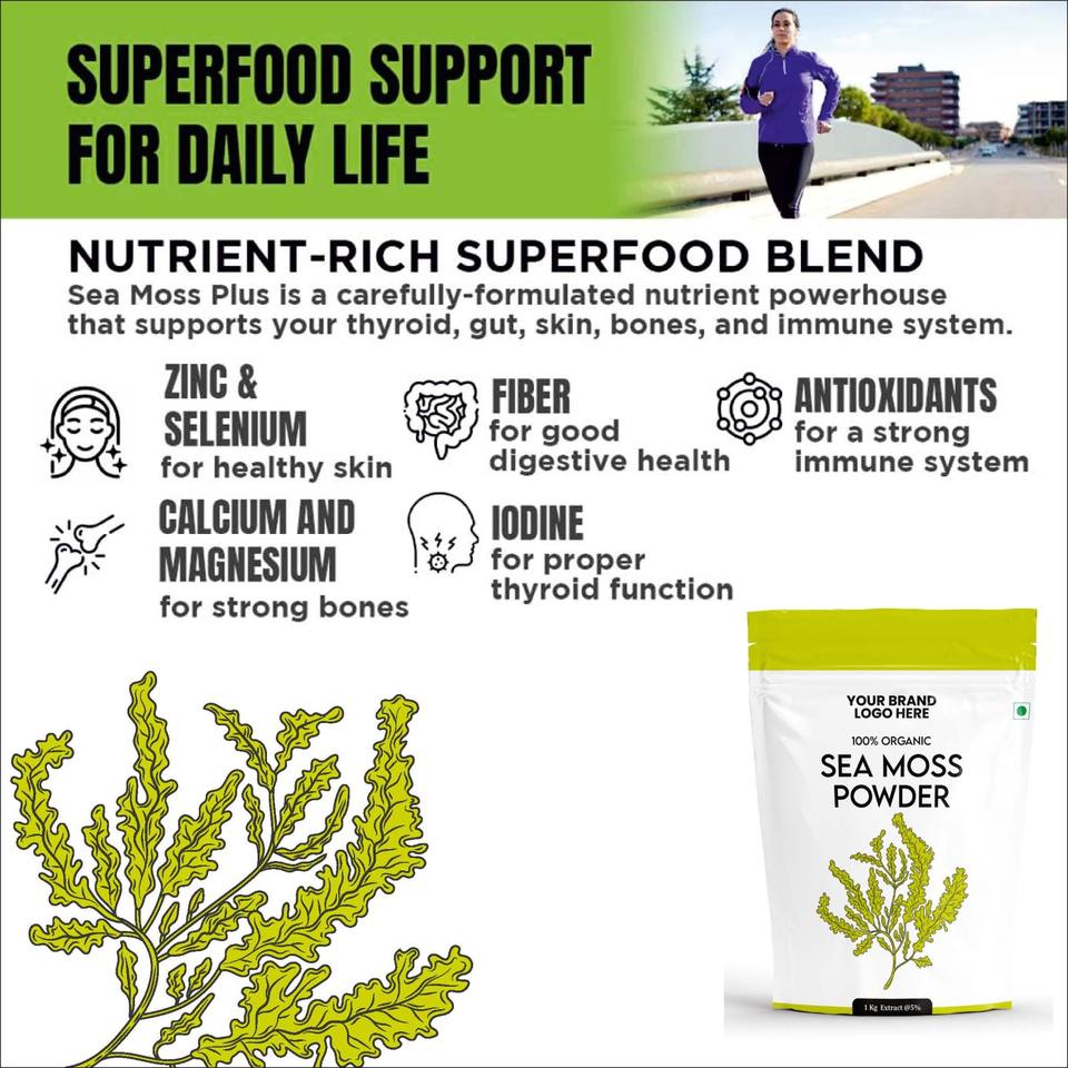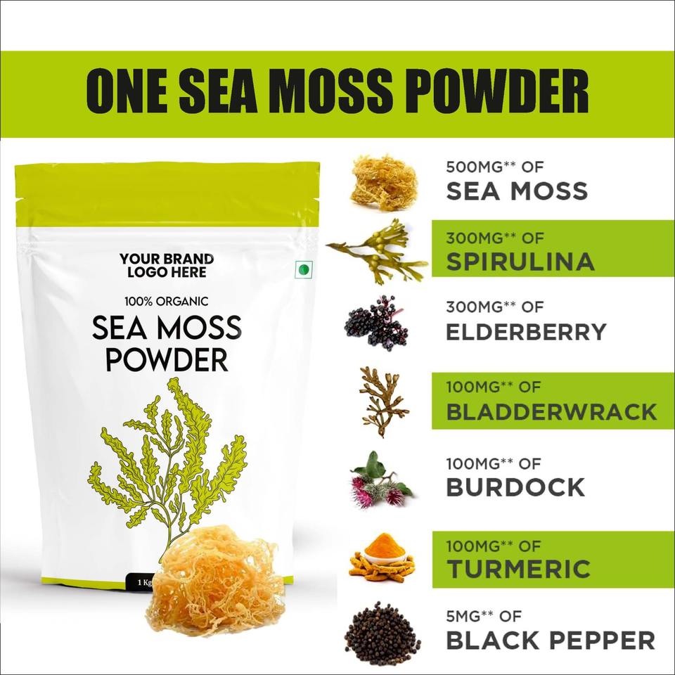 ส่วนผสมหลัก:Iodine, Chondrus crispus, minerals, vitamins, amino acids, dietary fiber, Polysaccharides, sea moss, vitamin a, vitamin k, vitamin c