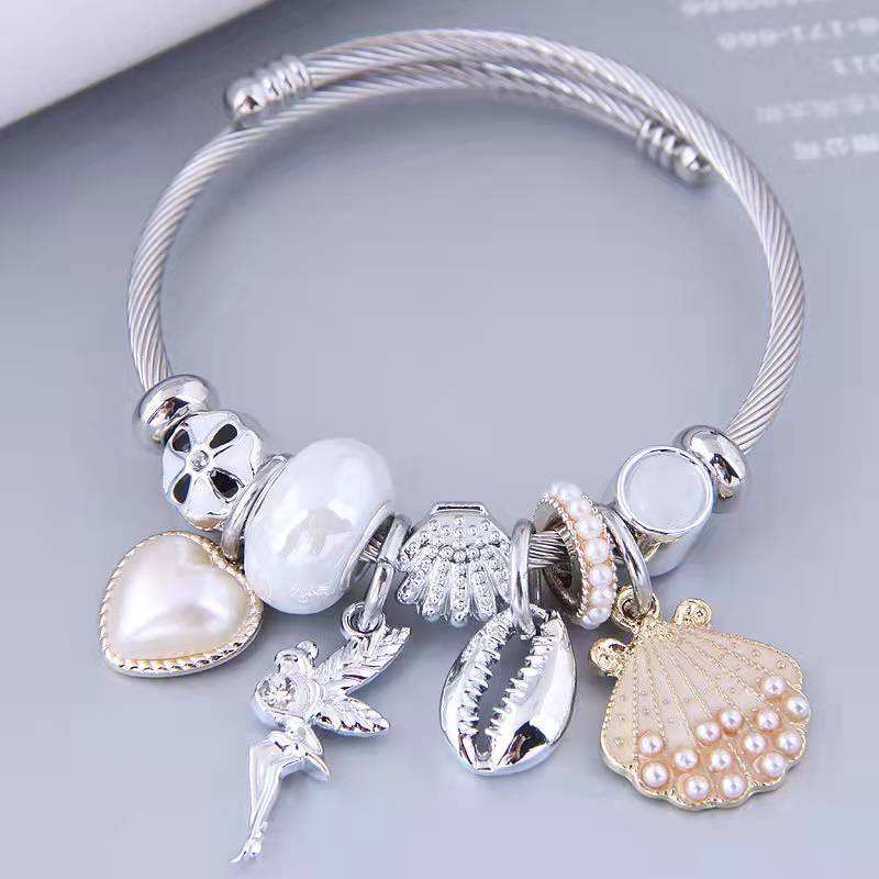 ทะเลเชลล์ลวดห่อลูกปัดสร้อยข้อมือสร้อยข้อมือลวดและเสน่ห์สแตนเลส