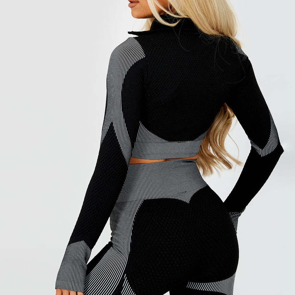 ชุดออกกำลังกายบราและแจ็กเก็ตแบบมีซิปเอวสูงของผู้หญิงชุดออกกำลังกายแบบยืดได้ผ้าไร้รอยต่อ3ชิ้น