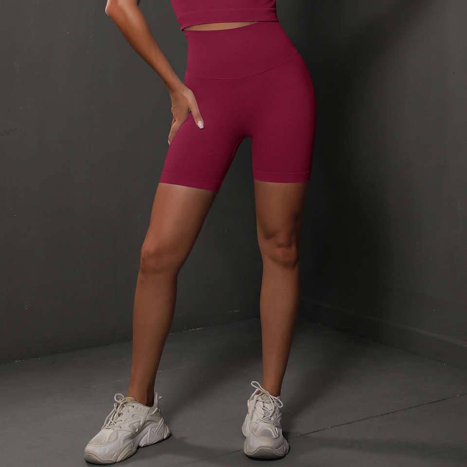 กางเกงโยคะขาสั้นสำหรับผู้หญิงกางเกงวิ่งและออกกำลังกายสีพื้นระบายอากาศได้แบบไร้รอยต่อรูปใบหน้าสีพีชยิ้ม