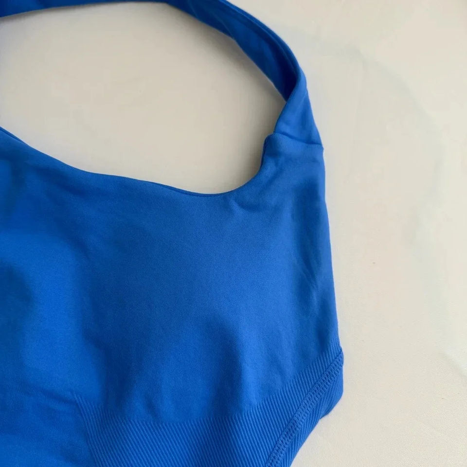 บราโยคะแบบเปิดหลังไร้ตะเข็บสำหรับผู้หญิงเสื้อครอปแบบคล้องคอเสื้อครอปเสริมฟองน้ำเสื้อออกกำลังกายในยิมเสื้อออกกำลังกายแห้งเร็ว