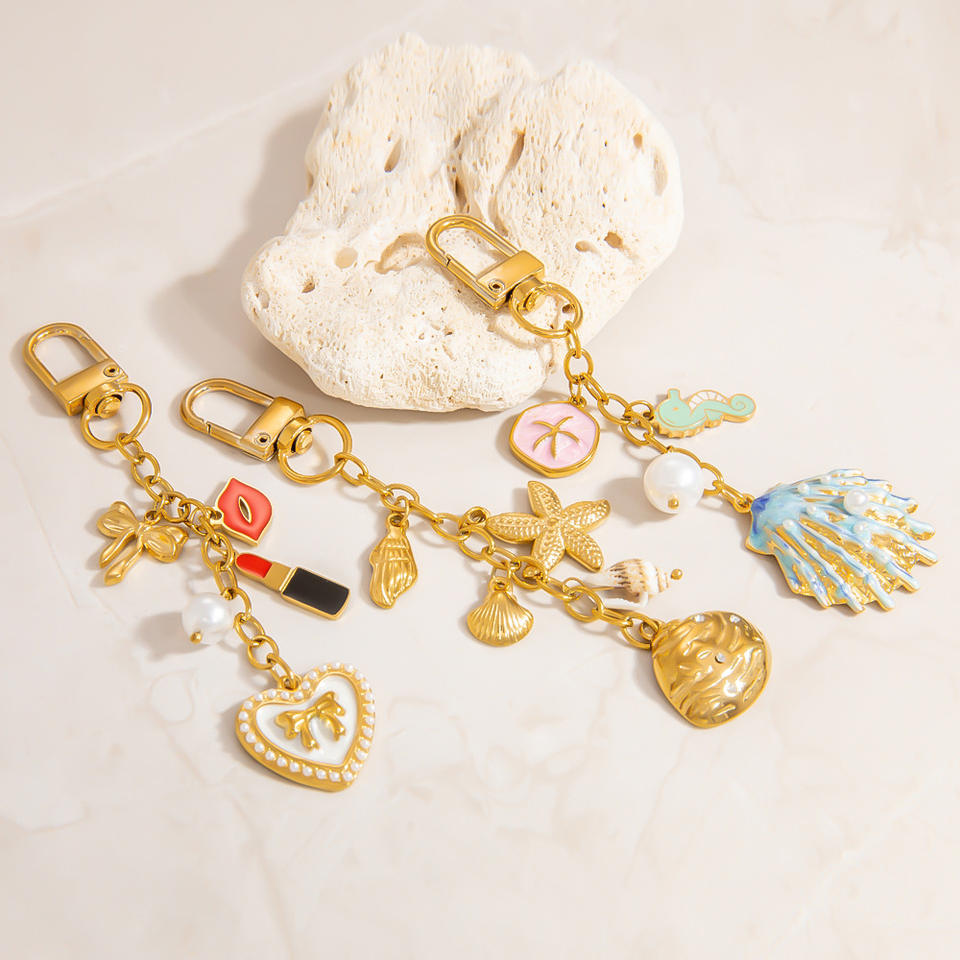 พวงกุญแจจี้รูปปลาดาวและเปลือกหอย สแตนเลสชุบทอง ของตกแต่งโทรศัพท์และกระเป๋า ลายสัตว์ทะเล