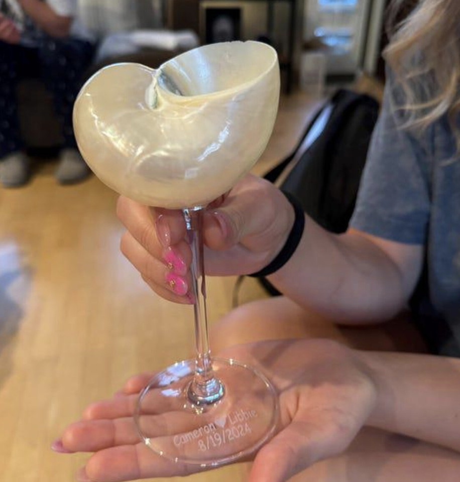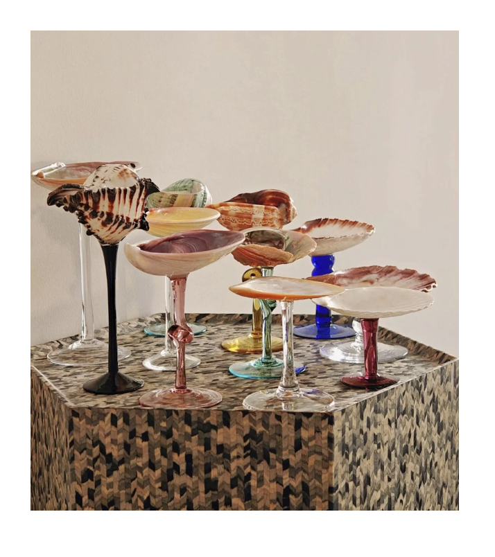 แก้วไวน์เปลือกหอยที่ออกแบบมาสำหรับการจัดแต่งอาหารโต๊ะกลางโต๊ะในร้านอาหารและแสดงบาร์