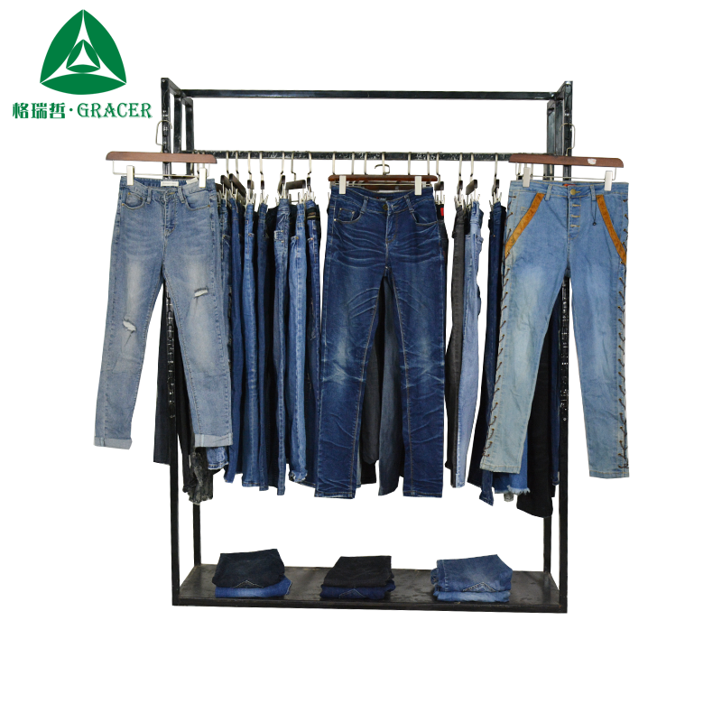 มือสองกางเกงยีนส์ของผู้หญิงในเสื้อผ้าที่ใช้เป็นก้อนมีความเสียหาย