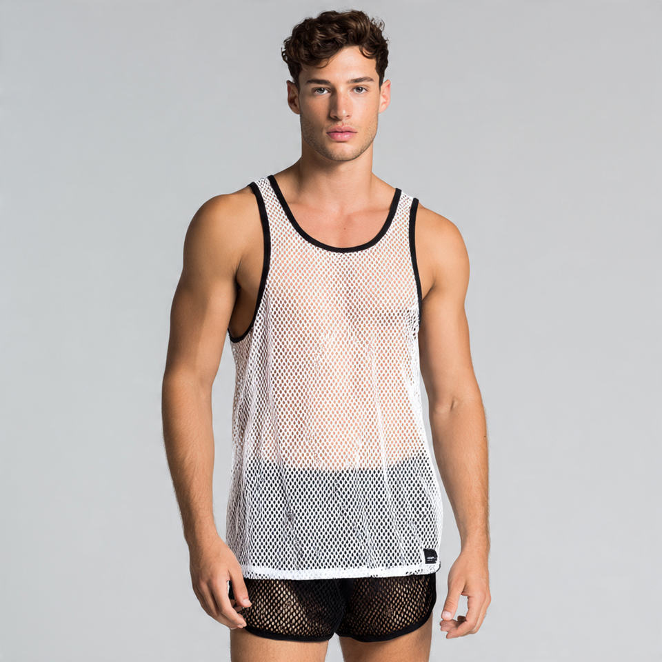 เสื้อกล้ามซีทรูผู้ชาย แขนกุด โปร่งใส แห้งเร็ว คอกลม ผ้าตาข่ายบาง