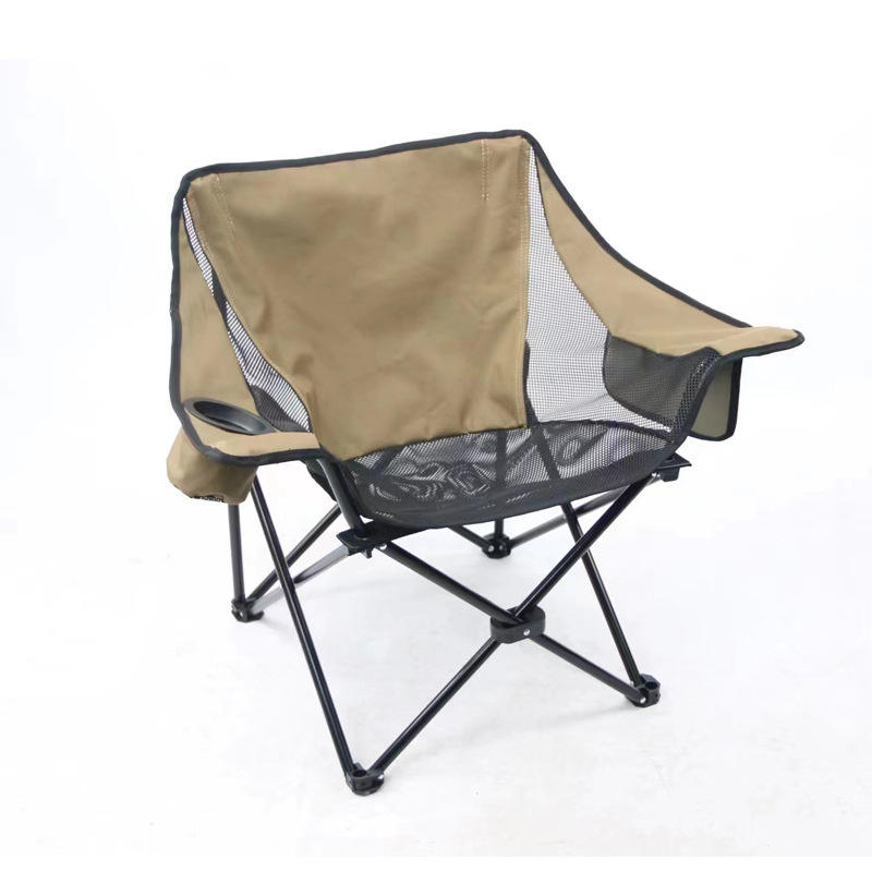 เก้าอี้พับกลางแจ้งสีกากีระบายอากาศได้ดีพร้อมที่วางแก้วและกระเป๋าด้านข้างแบบพกพาสำหรับการตั้งแคมป์ปิกนิกในสวน