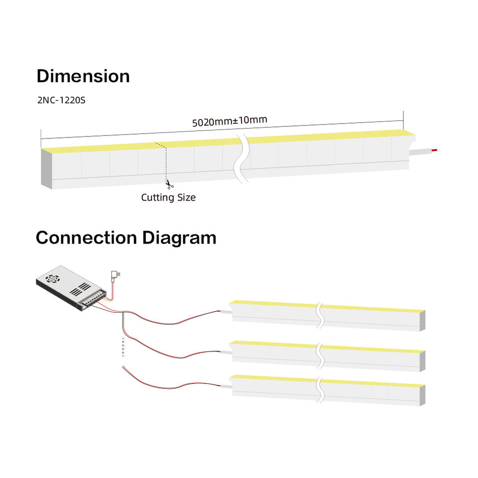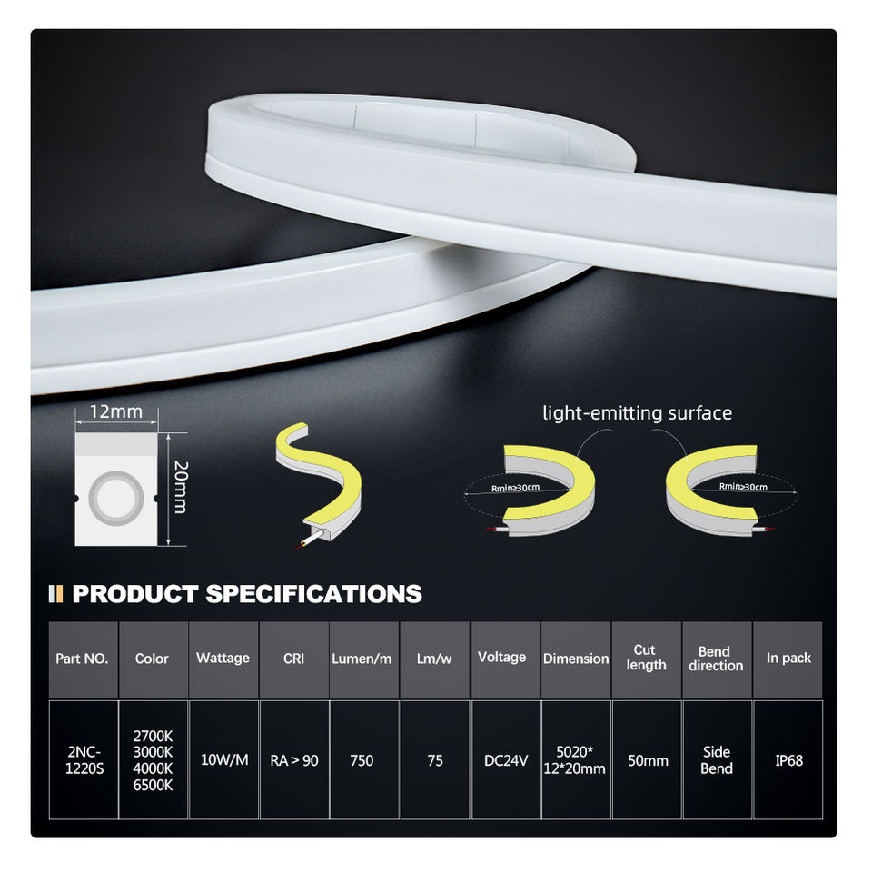 ปลอกหุ้มไฟนีออนกันน้ำแบบ IP68 รุ่น 2NC1220S แบบโค้งด้านข้าง 10W/M DC24V ตัดได้ทุกขนาด 50 มม. 2700K ถึง 6500K ปรับค่า CCT ได้หลากหลาย