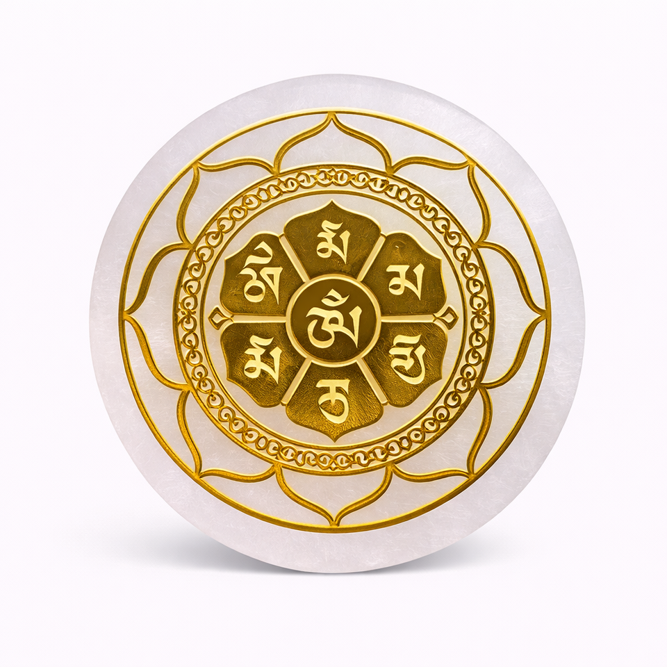 แผ่นเซเลไนต์ขัดเงา ลวดลายออมมณีปัทเมหุม แมนดาลา สีทอง สำหรับการทำสมาธิ คริสตัลเรกิ บำบัดจักระ ทำความสะอาดพลังงาน
