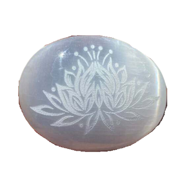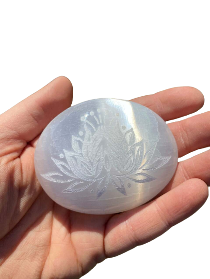 Selenite Palm Stone Laser Engraved with Lotus Flower Healing Gemstone Pebble Palm Carved Quartz Agate Crystal Palm Stones