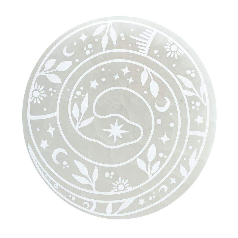 แผ่นเซเลไนต์ขัดเงา (3 นิ้ว/4 นิ้ว) ลายหยินหยางดอกไม้พระจันทร์ แกะสลักจากคริสตัลสีขาวธรรมชาติ สำหรับการทำสมาธิที่บ้าน