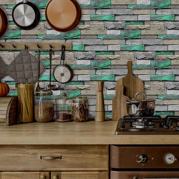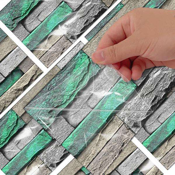 Self-Adhesive Peel Stick Wallpaper Green Brick Stone Pattern Water Resistant Oil-Proof Detachable Wall Covering for Living Room