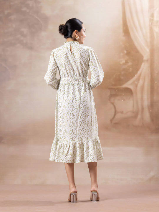 เดรสออกแบบเอง คอเต่า แขนยาว แต่งสม็อค ความยาวปานกลาง ชายกระโปรงระบาย ผ้าแจ็คการ์ด ติดกระดุม