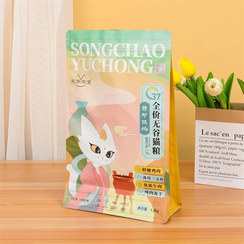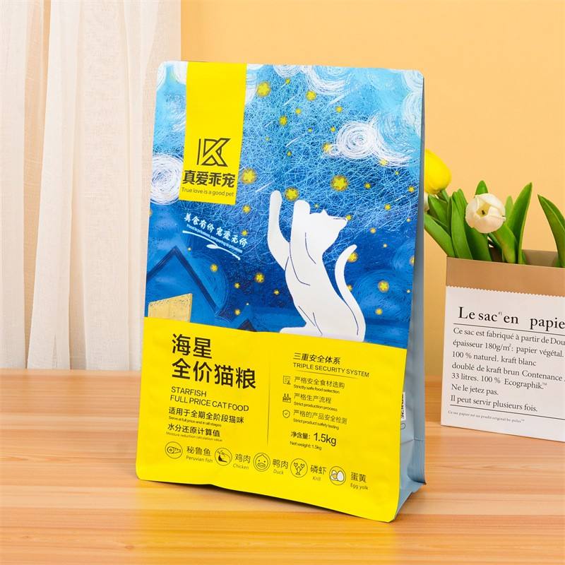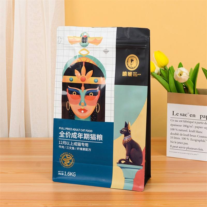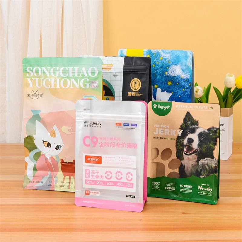 ถุงบรรจุภัณฑ์อาหารสัตว์เลี้ยงแบบปิดผนึกเองได้ ตั้งได้เอง ขายส่ง ถุงฟอยล์พลาสติกอลูมิเนียมสำหรับอาหารแช่แข็งแบบปิดผนึกแปดด้าน
