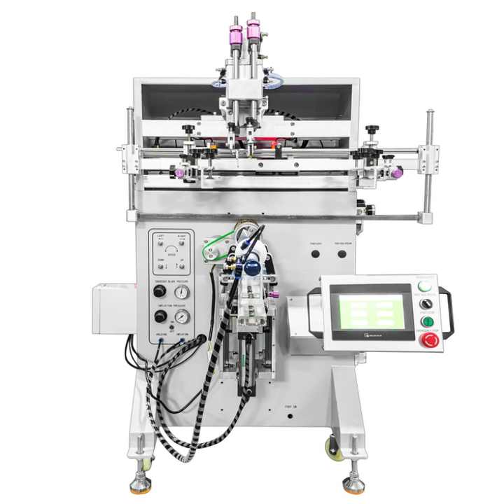 เครื่องพิมพ์สกรีนทรงกระบอกกึ่งอัตโนมัติ พร้อมระบบควบคุม PLC+หน้าจอสัมผัส ระบบกำหนดตำแหน่งอัตโนมัติหลายสีสำหรับผลิตภัณฑ์ทรงกระบอก