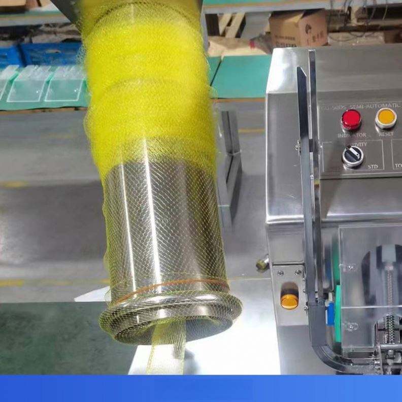 เครื่องบรรจุภัณฑ์แบบกึ่งอัตโนมัติสำหรับขิง มันฝรั่ง หัวหอม ผลไม้ ผัก บรรจุในถุงตาข่ายพร้อมปิดผนึก